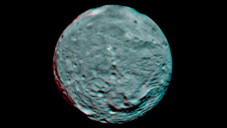 This anaglyph image of the south polar region of the asteroid Vesta was put together from two clear filter images, taken on July 9, 2011 by the framing camera instrument aboard NASA's Dawn spacecraft. Each pixel in this image corresponds to roughly 2.2 miles (3.5 kilometers). The anaglyph image shows the rough topography in the south polar area, the large mountain, impact craters, grooves, and steep scarps in three dimensions. The diameter of Vesta is about 330 miles (530 kilometers). Use red-green (or red-blue) glasses to view in 3-D (left eye: red; right eye: green (or blue)).