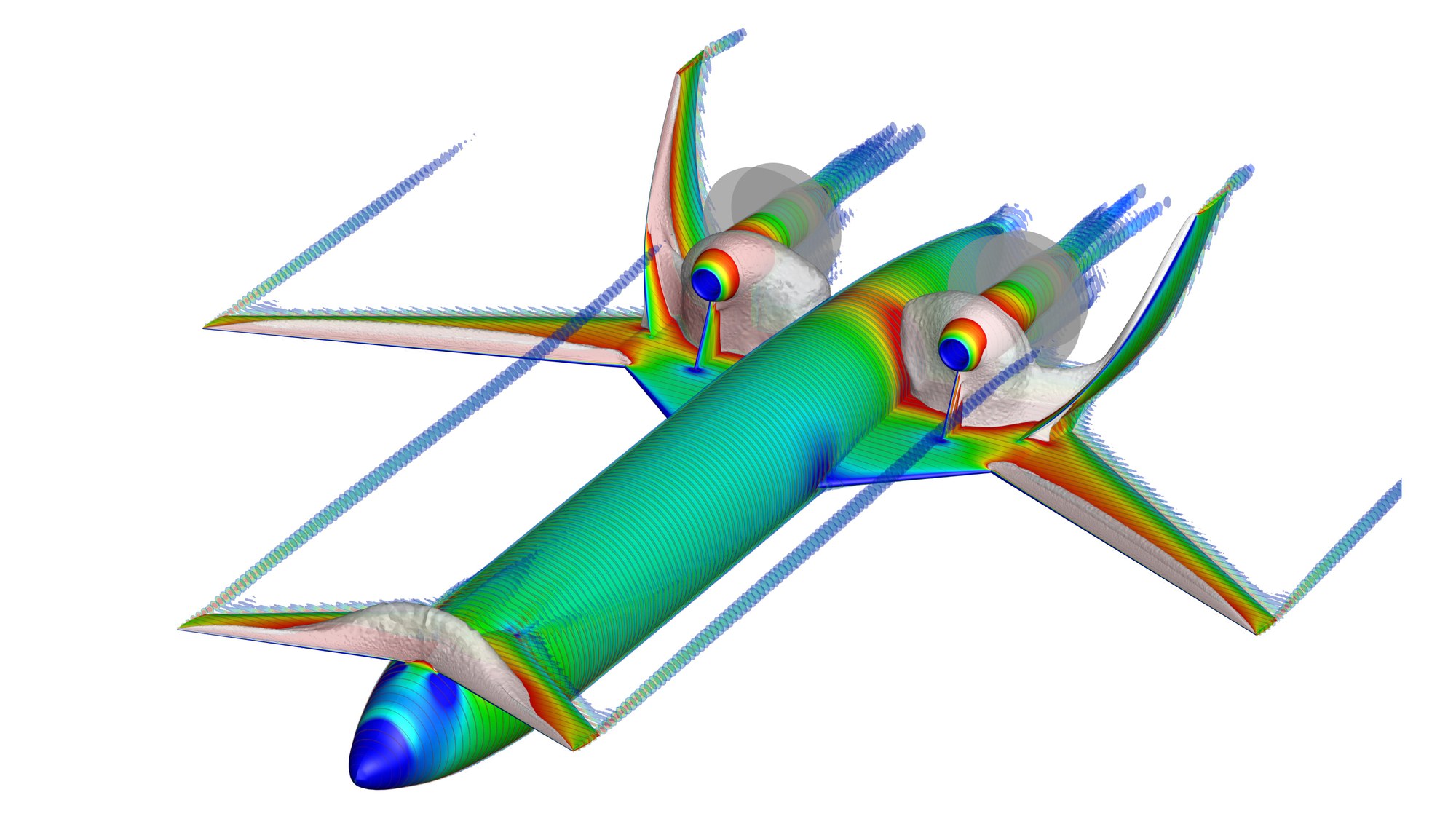 Local flow velocity, turbulence and supersonic regions around the DLR-LNA during cruising flight.
