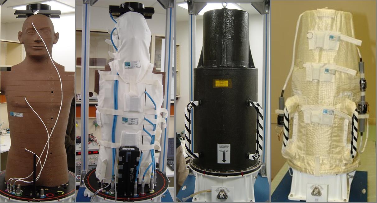 The MATROSHKA human phantom is used to measure radiation exposure. The four versions shown here represent (from left to right): an upper body designed to replicate the human form without 'clothing'; wearing a poncho and cap; enclosed within a carbon fibre container to simulate the protective effect of a spacesuit; covered with thermal insulation.