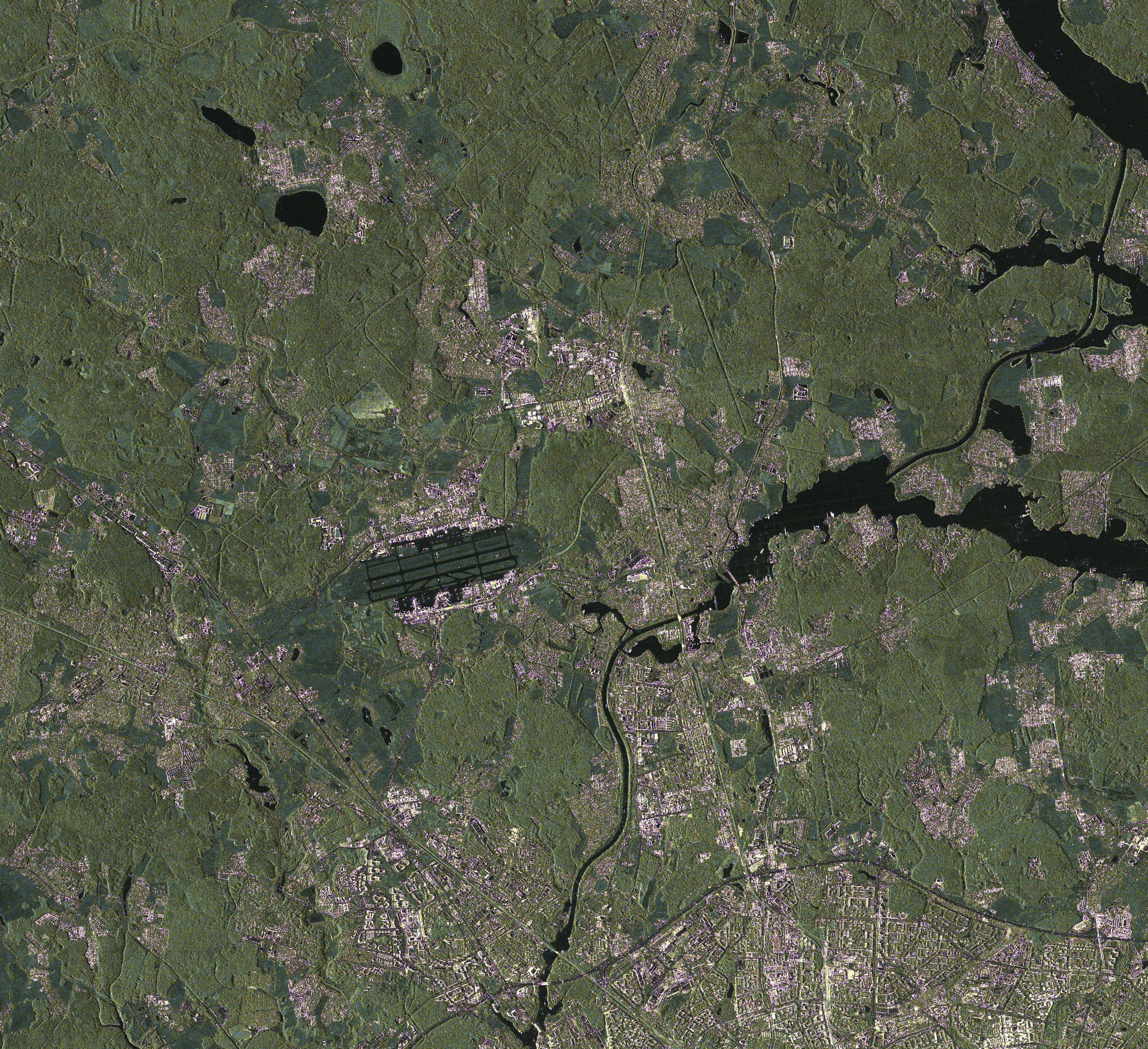 At the centre of the image is Moscow’s Sheremetyevo Airport, about 30 kilometres northwest of the city centre. Terminal One, to the north, was opened on 8 November 1959 and now serves mainly domestic flights. Terminal Two, in the south, was built for the Summer Olympic Games in 1980 by German companies following the design of the terminal at Hanover Airport. Today, it deals with international flights. The two runways are clearly visible. Because the flat concrete surfaces reflect the radar signals away from the satellite, the paved areas are shown as black lines. To the north of Moscow, there are major reservoirs such as the Pirogovskoye Reservoir and the Uchinskoye Reservoir.
