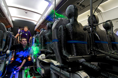 DLR and Airbus flight-test new aircraft ventilation system. DLR researchers Gerrit Lauenroth (front) and Felix Werner adjust the laser. This makes the airflow visible.