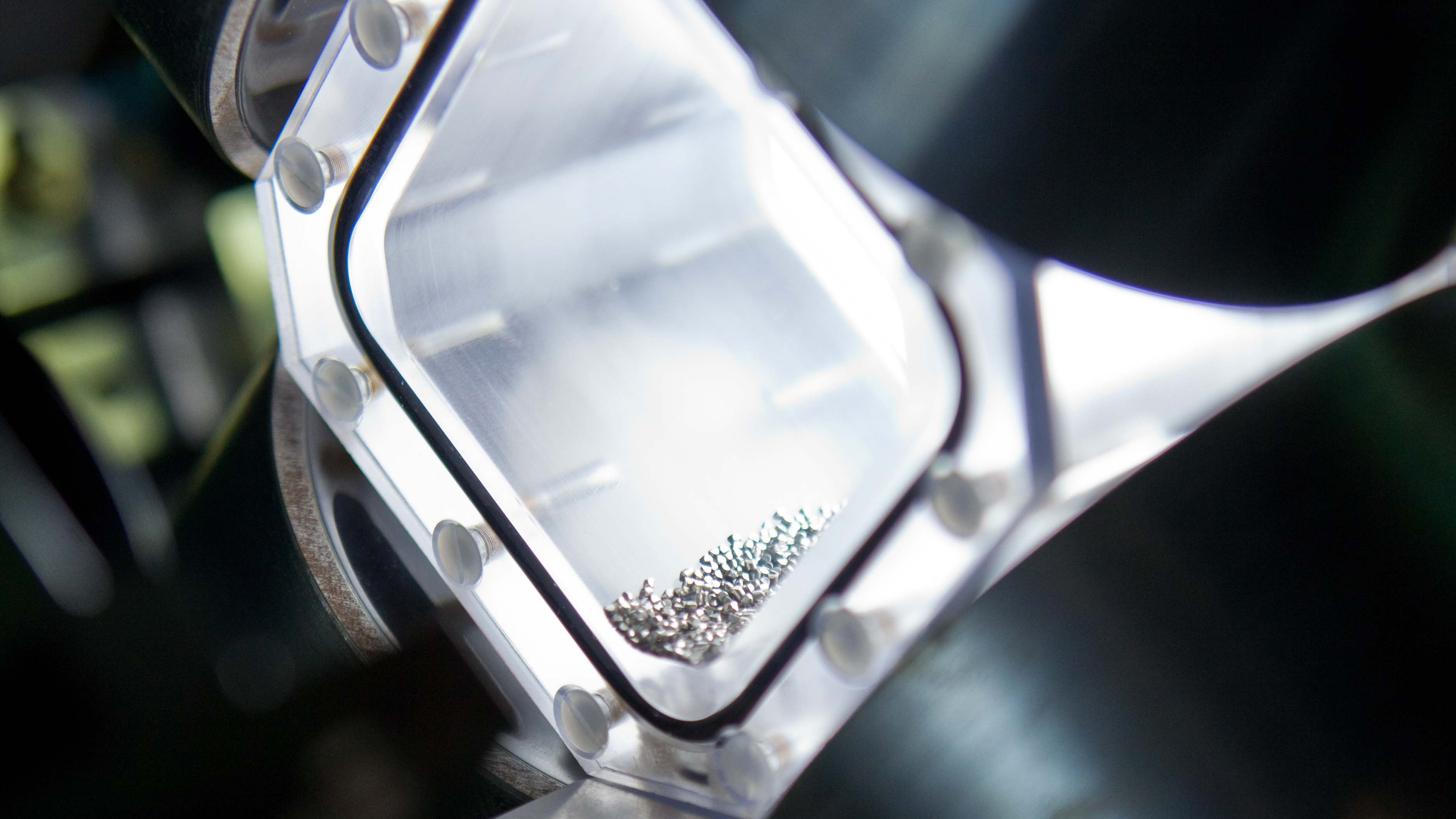 The granulate gases in the MEGraMa-M experiment: When subjected to conditions of microgravity, the spherules float in the brightly lit sample container. The circular electromagnets on the four sides of the container caused the particles to move.