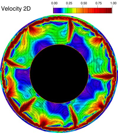 This sectional view shows the calculated mantle convection structure during the early history of Venus. In the outermost green areas, the surface was stretched and elongated about three millimetres per year by the underlying layer.