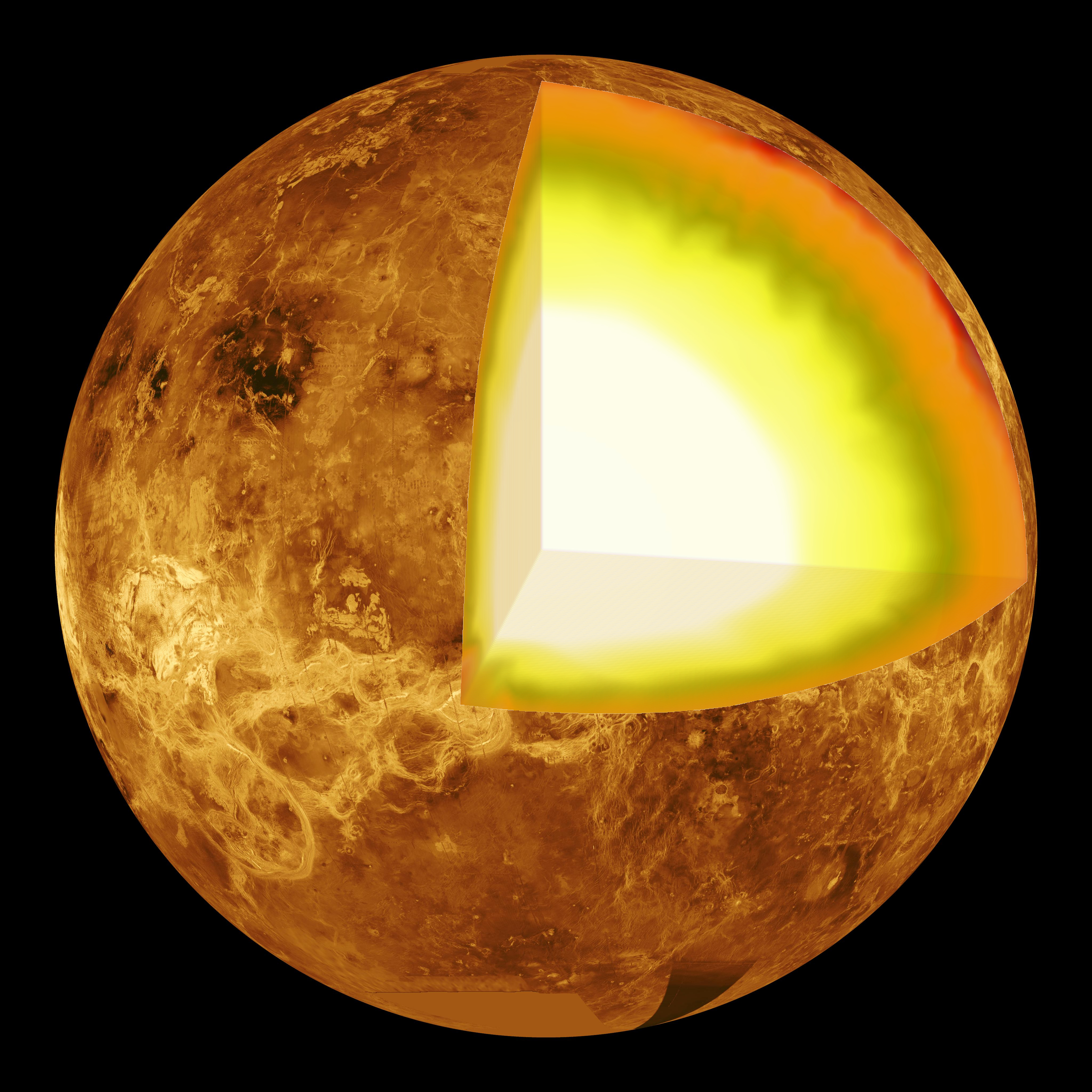 Simulation of the temperature distribution inside Venus during its early history. Red corresponds to a crustal temperature of around 530 degrees Celsius. In the interior, the temperature increases.