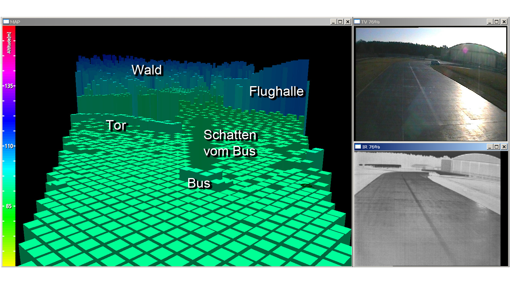 DLR's ALLFlight (Assisted Low Level Flight and Landing on Unprepared Landing Sites) research project involves the development of a system that generates a digital map for the cockpit, and helps the pilots in difficult situations - up to a fully automated landing. A total of four sensors are used in the creation of three-dimensional digital environment maps: TV camera, infrared camera, laser and radar. Once the data is combined, the pilot will only see a picture of the environment. On the top right is the environmental image obtained with the TV camera. The 3D image is visible on the left.
