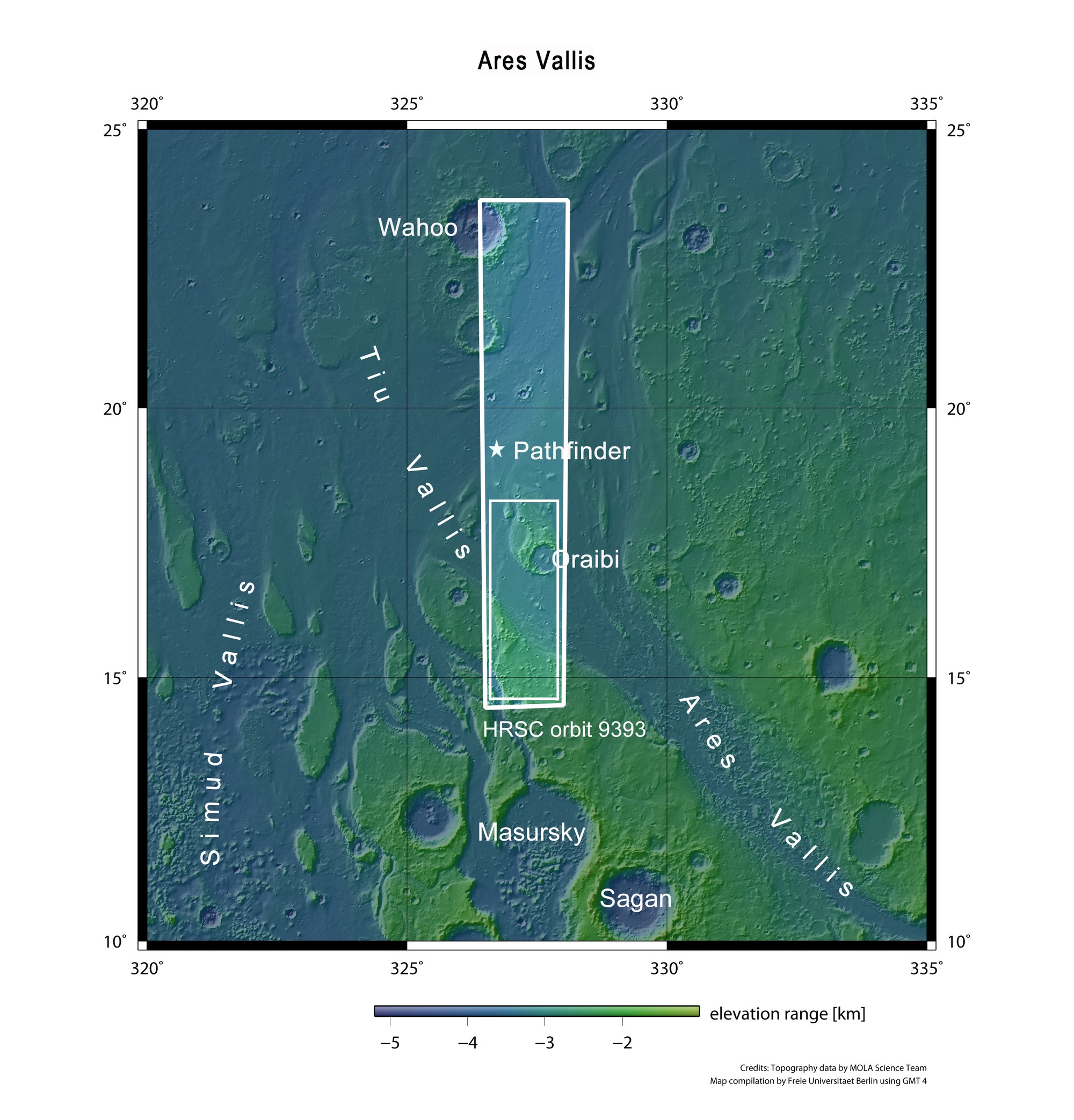 This map shows the area surrounding the mouth of Ares Vallis, a large outflow channel with its origin in the southern highlands of Mars and, at about 15 degrees north, flows out into the lowlands of Chryse Planitia. The larger framed area shows the location of the entire image strip that was acquired by the High Resolution Stereo Camera (HRSC) on board ESA’s Mars Express orbiter on 11 May 2011 during orbit 9393. The smaller framed area shows the location of the images described in this article. The asterisk marks the site where NASA’s Pathfinder mission landed on 4 July 1997. A small rover, Sojourner, spent 12 weeks exploring the area around the landing site.