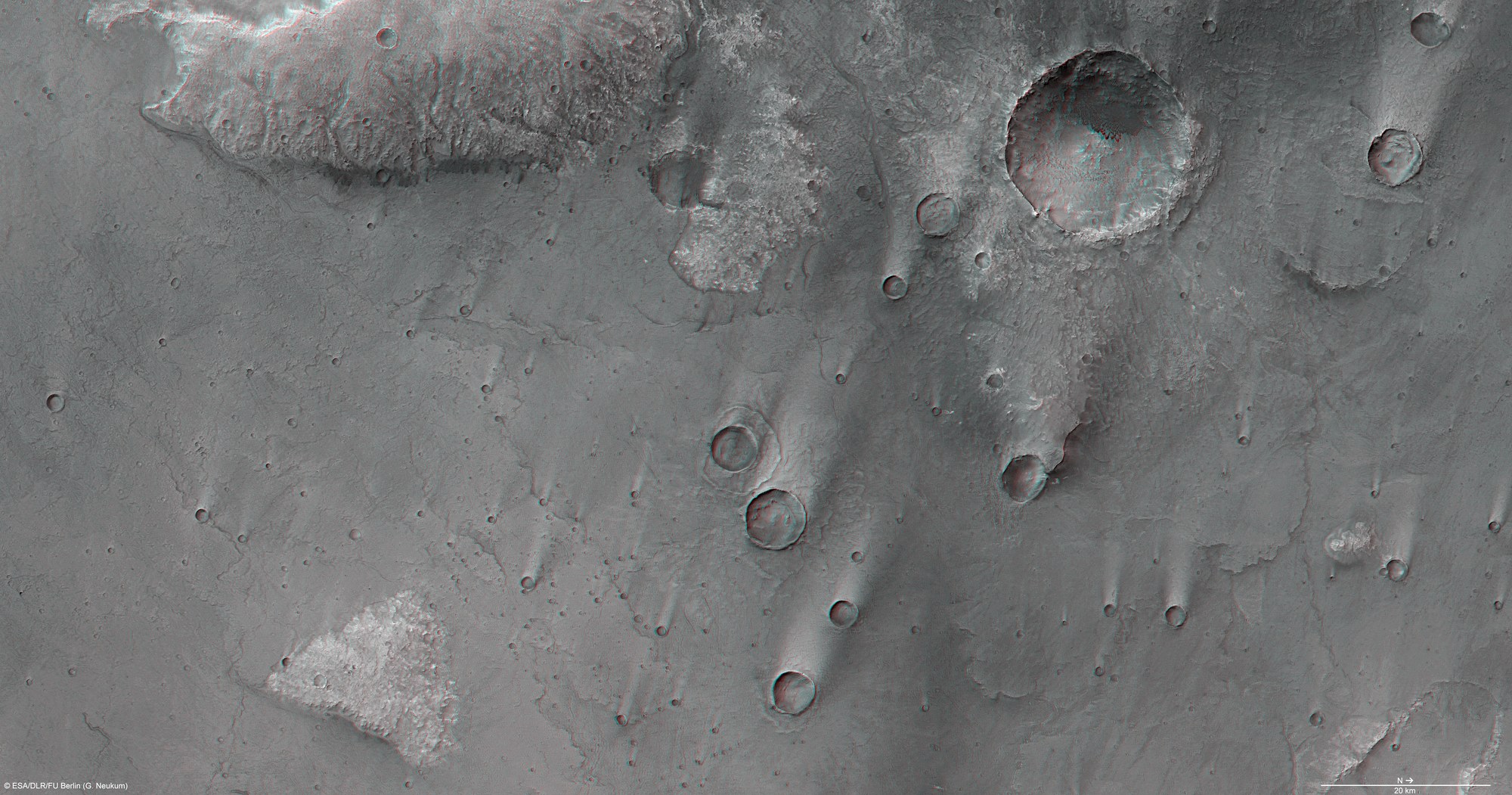 Anaglyph images can be created using data from the nadir channel of the High Resolution Stereo Camera (HRSC) camera system, the field of view of which is which is directed vertically down onto the Martian surface, and one of the four stereo channels, which are directed obliquely towards the surface. By using red/blue (cyan) or red/green glasses, a three-dimensional impression of the landscape can be obtained; north is to the right in the image.
