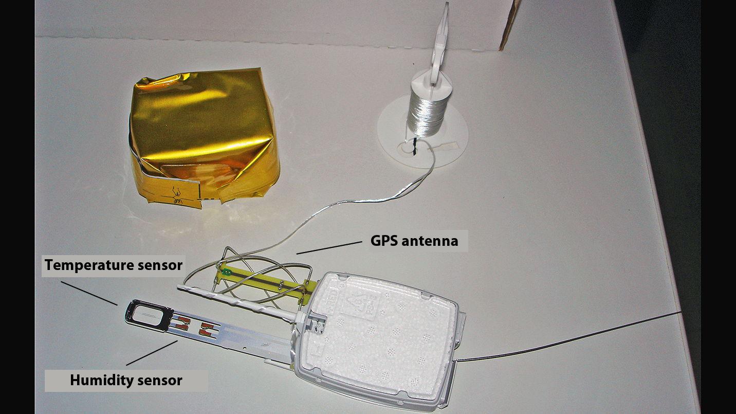 The radiosonde is equipped with a GPS antenna and sensors to measure air temperature and humidity. The navigation data provides not only information about the position of the sonde, but also about the prevailing wind speed. The battery (next to the radiosonde and still in its packaging) is inserted into the sonde. The radiosonde is attached to a sounding balloon and sent on its measurement journey.