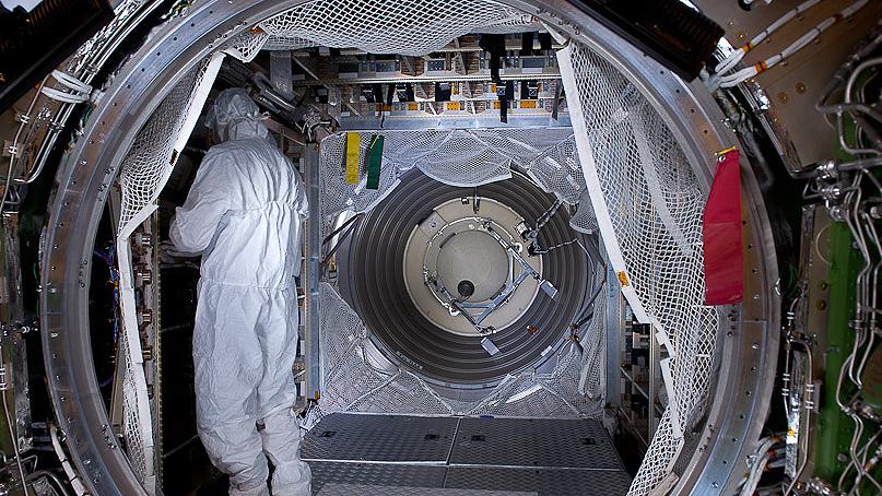 Specialists at Europe's Spaceport in French Guiana stowing the dry cargo by hand in the ATV-3 space freighter.