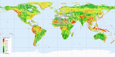 A year after the initial operational phase, TanDEM-X has mapped all land surfaces on earth except Antarctica completely. Elevation models have been generated with the data. According to the color scale, green tinted areas already comply with a the requirement of a two-metre accuracy. Yellow-coloured areas must be recorded a second time, reddish surfaces also require recording from a different angle. Gray-shaded strips have been recorded, but have yet to be processed.