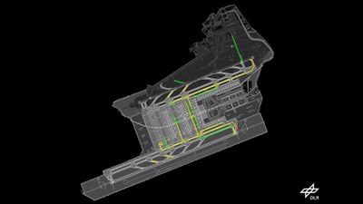 The coloured taxiways show approximately the amount of fuel used and emissions produced when aircraft are taxiing. The scale ranges from no colour (no fuel consumption and emissions), through green and yellow (low fuel consumption and low emissions), to red for higher amounts.