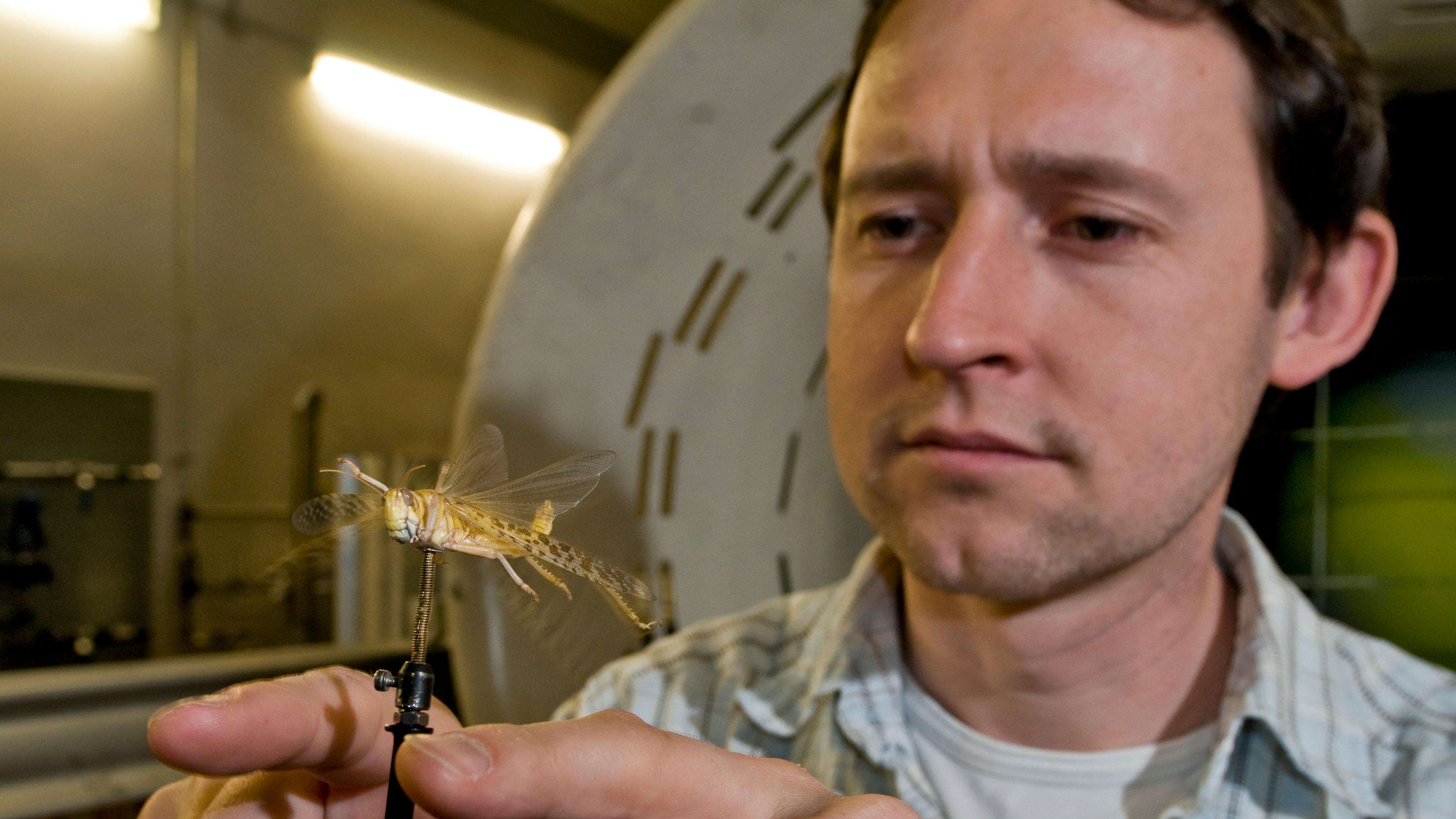 Paradigm for mini-aircraft – locusts are excellent fliers so, researchers at the German Aerospace Center (DLR), together with the University of Oxford and the optical metrology company LaVision GmbH, are studying them in a wind tunnel at DLR Göttingen. The insects are fixed to small rods with a drop of glue, which can be removed upon completion of the tests without harming them.