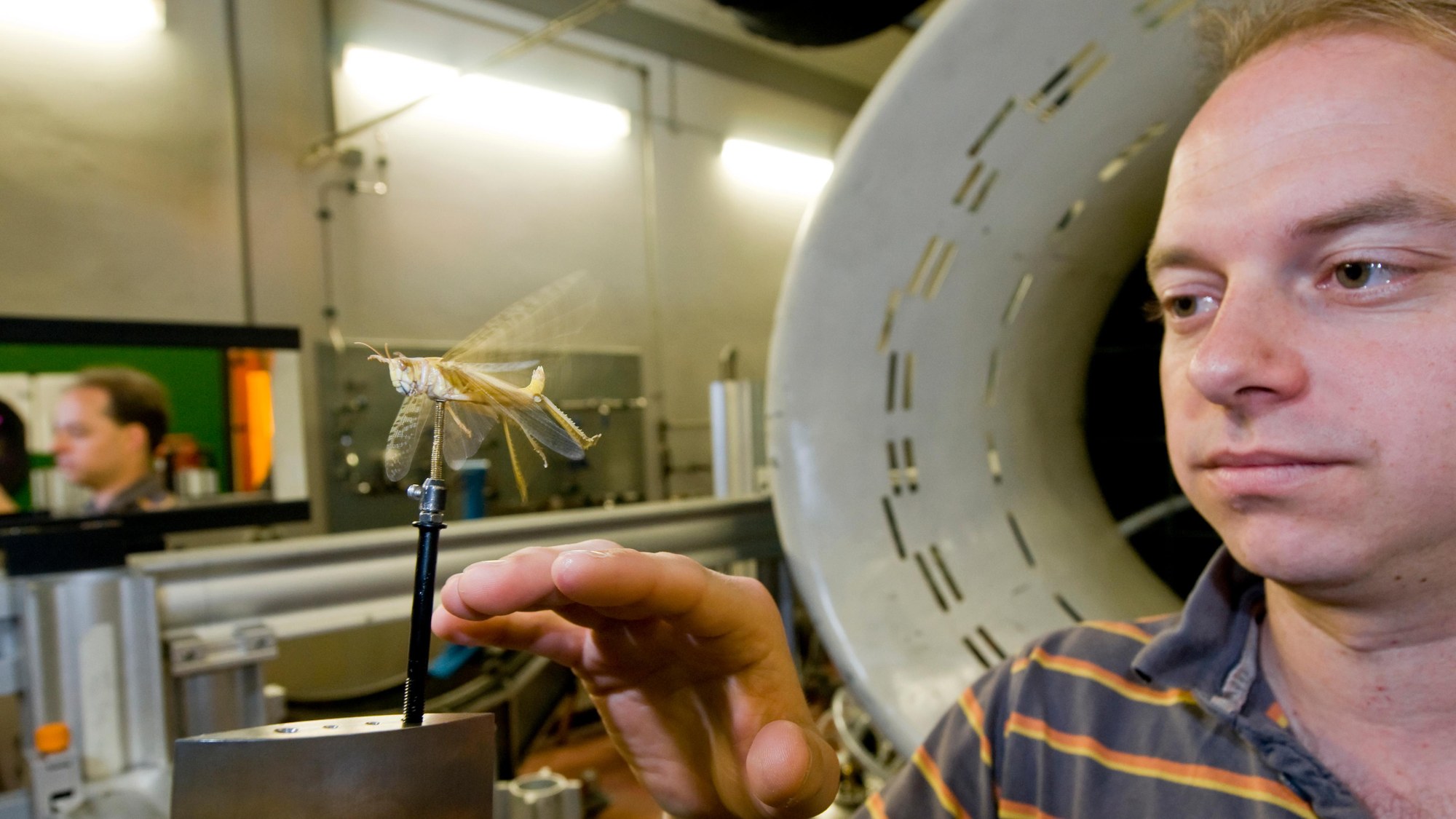 A locust in the wind tunnel at DLR Göttingen, with Per Henningsson from the University of Oxford. The insects are fixed to small rods with a drop of glue, which can be removed upon completion of the tests without harming them.