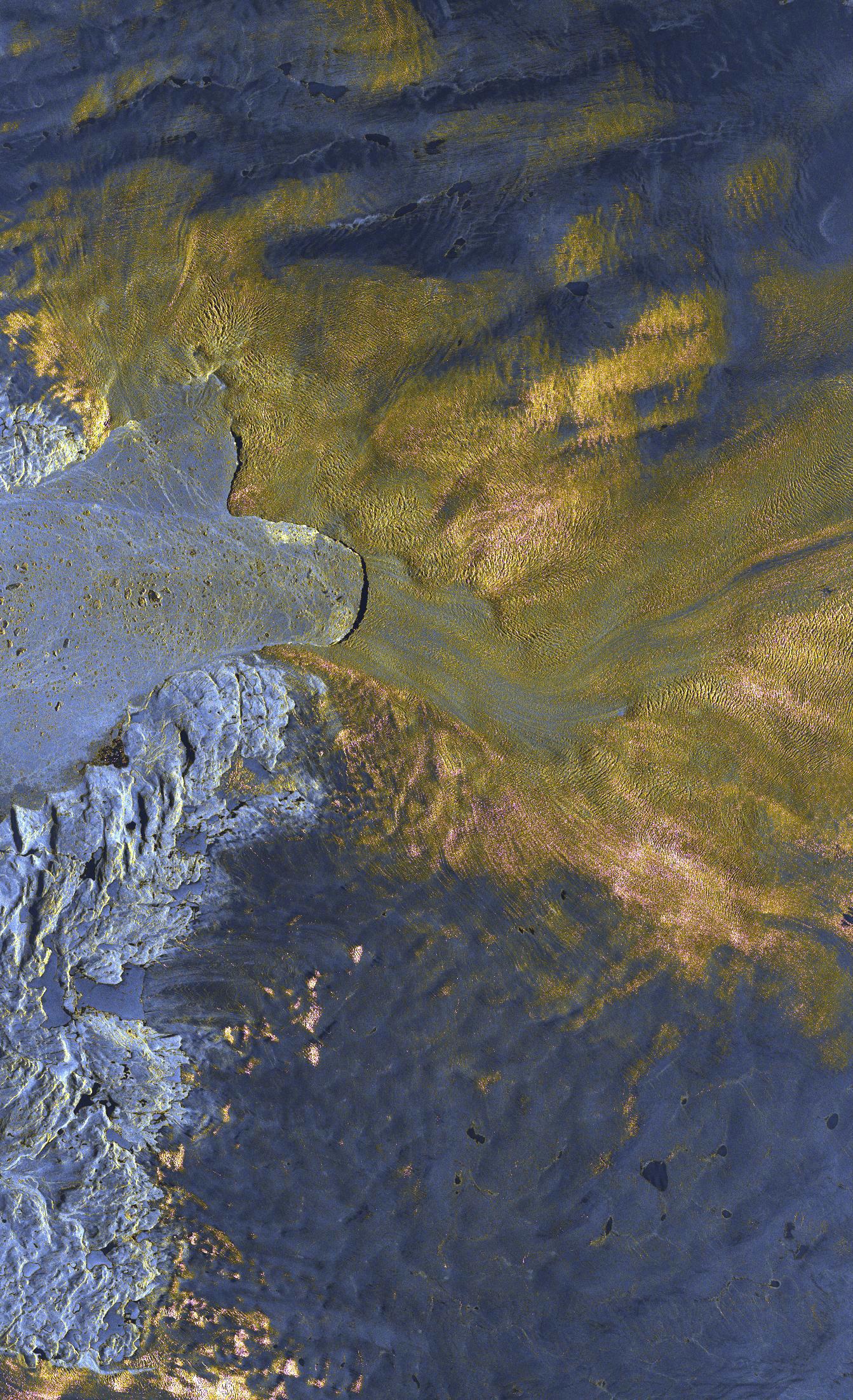 Jakobshavn Isbræ, in Greenland, is one of the fastest-moving glaciers in the world; the mass of ice is advancing up to 35 metres per day towards the sea, and is threatened by climate change. The progress of glacial melting can be documented by comparing satellite images acquired in different years. The processed radar data shows the glacier structure in false colour. Smooth ice surfaces are coloured blue; magenta shows prominent structures like crevasses, while yellow indicates roughened surfaces and thus clearly marks the flow movement. It can be seen that the ice sheet advances to a narrow zone (left-hand side of image) and eventually breaks abruptly into the ‘smooth’ open sea.