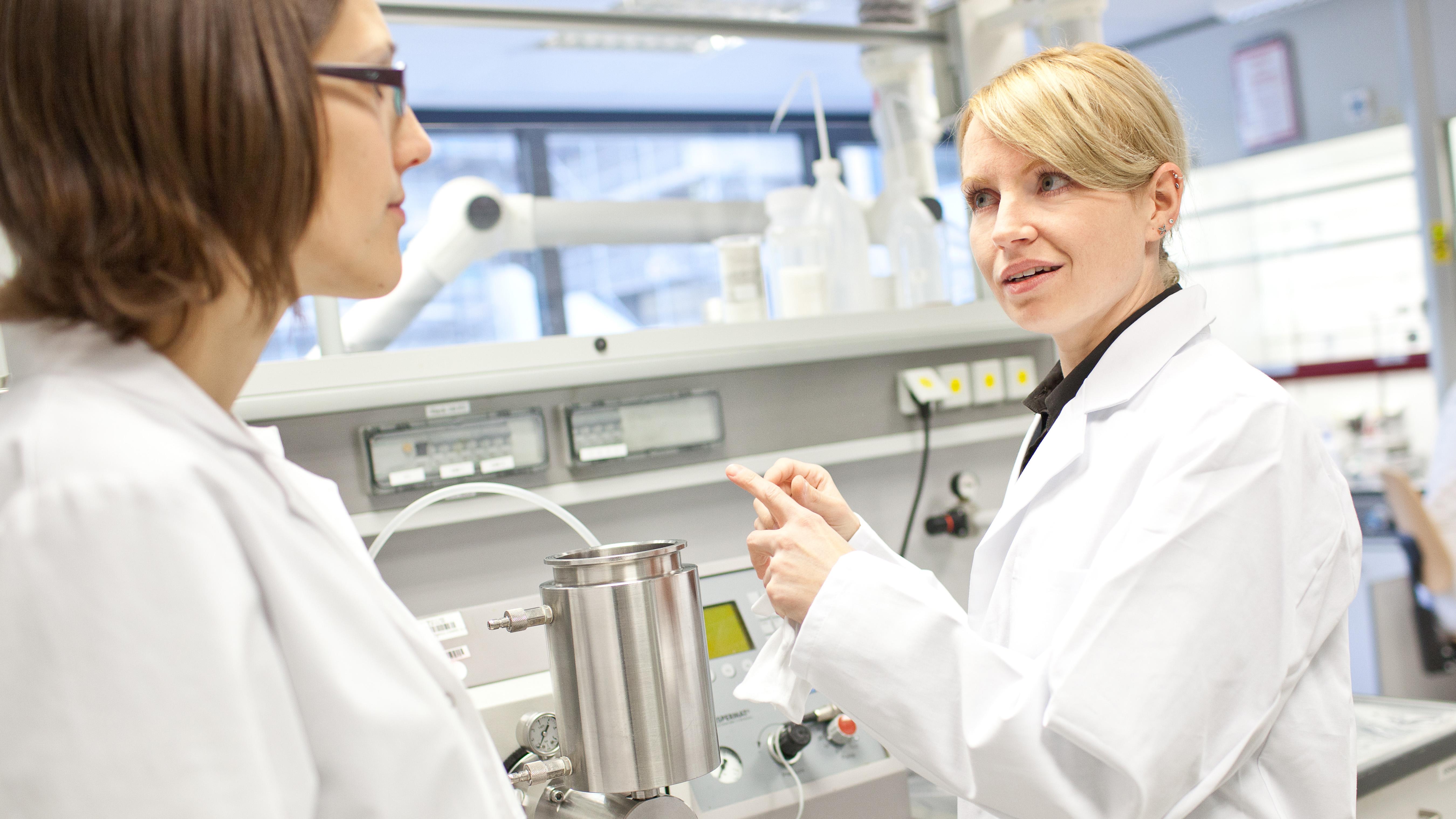 Christine Arlt with her colleague Wibke Exner in the laboratory conducting research into nanoparticles.