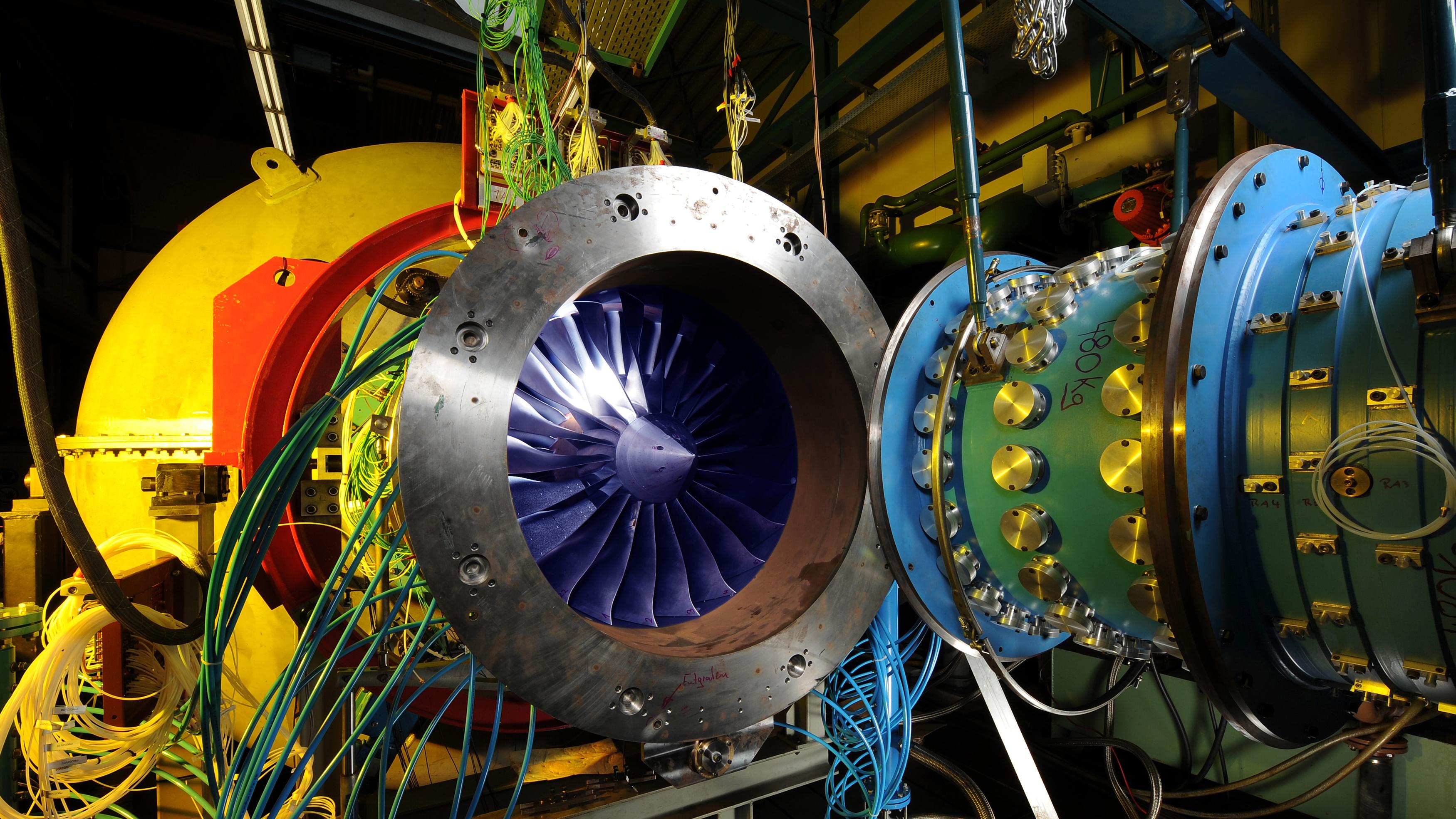 DLR in Cologne is using the Ultra High Bypass Ratio (UHBR) test system to examine new methods for noise suppression, demonstrating it on a realistic model of a part of the engine.