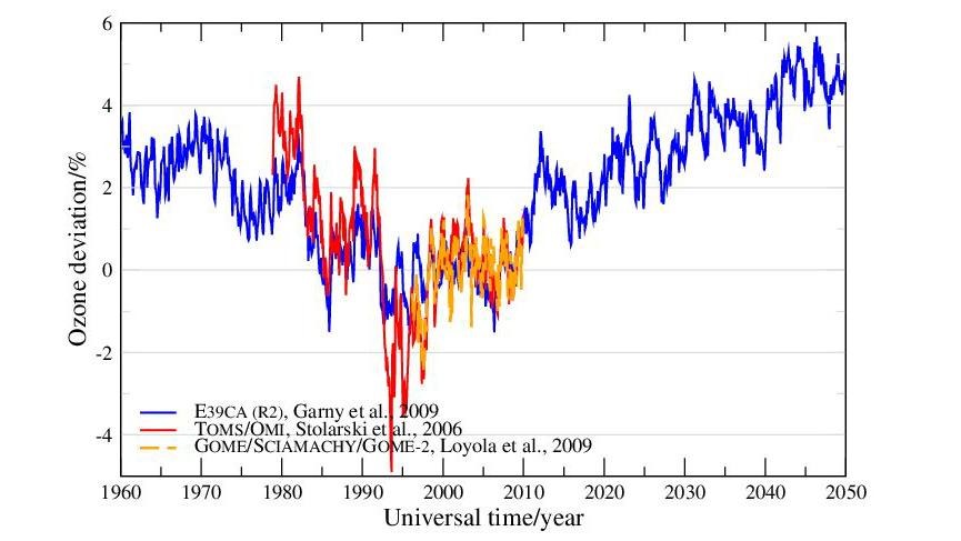 Anomalies in the global levels of ozone – orange and red lines represent satellite observations; the blue line shows the results of a digital simulation with a DLR climate chemistry model. The ozone layer reached its lowest levels in the nineties and has been recovering ever since.