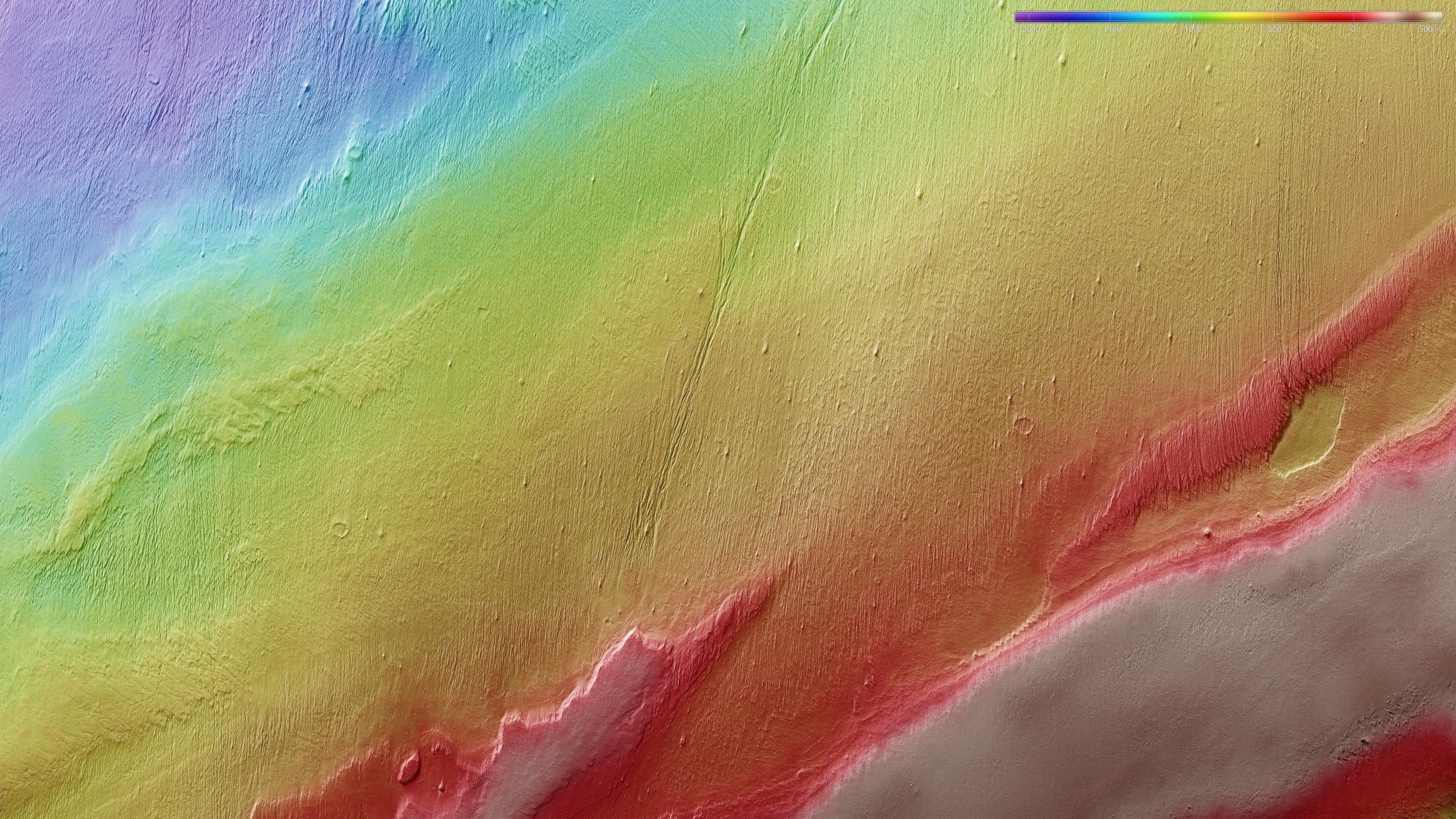 Using the HRSC stereo camera, digital terrain models can be derived that illustrate the topography of the region using false colours. The altitude allocation can be read from a colour scale at upper right; north is to the right in the image. Gordii Dorsum is a range of hills on Mars about 500 kilometres long, lying some 1000 kilometres southwest of the giant volcano Olympus Mons.