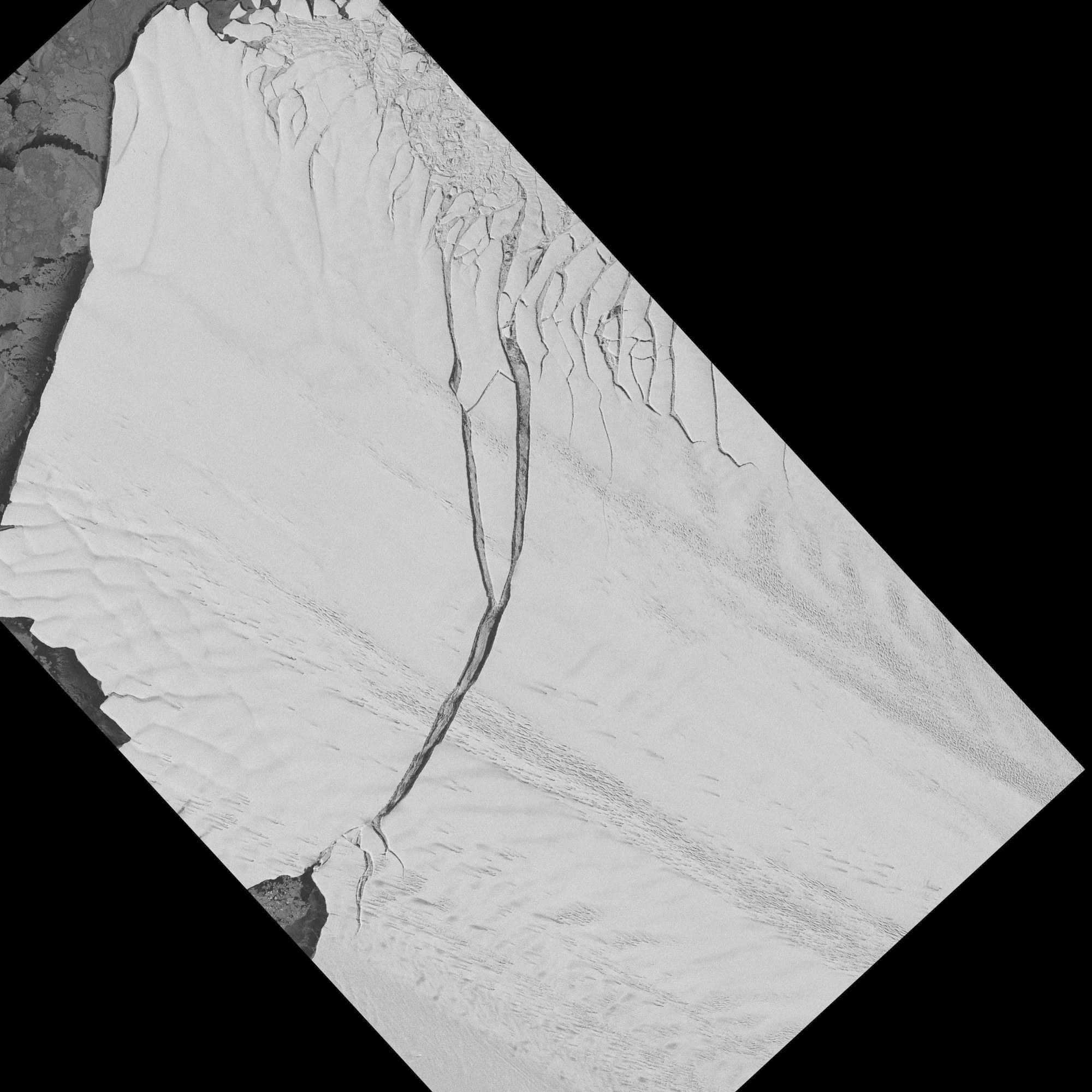 The TerraSAR-X image, acquired on 8 July 2013 shows the calved iceberg on Pine Iceland Glacier in the Southern Ocean, which has an area of roughly 720 square kilometers. The glacier broke large icebergs, known as tabular icebergs,into the Amundsen Sea between 2001 and 2007.