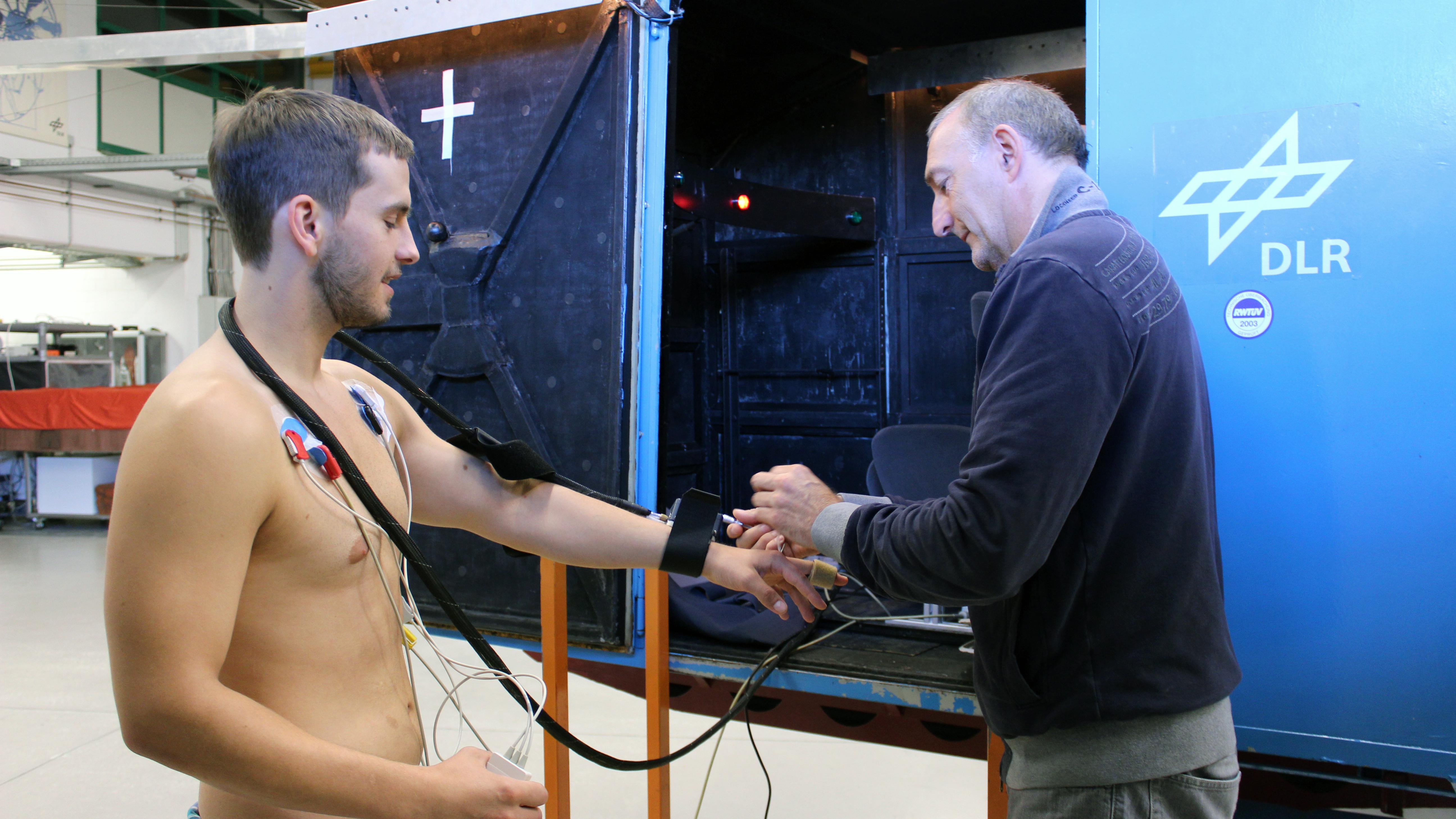 Peter Gauger from the German Aerospace Center (DLR) wires up the candidates before they get into the long-arm centrifuge, allowing the scientists to measure factors such as blood pressure and heart rate during the ride.