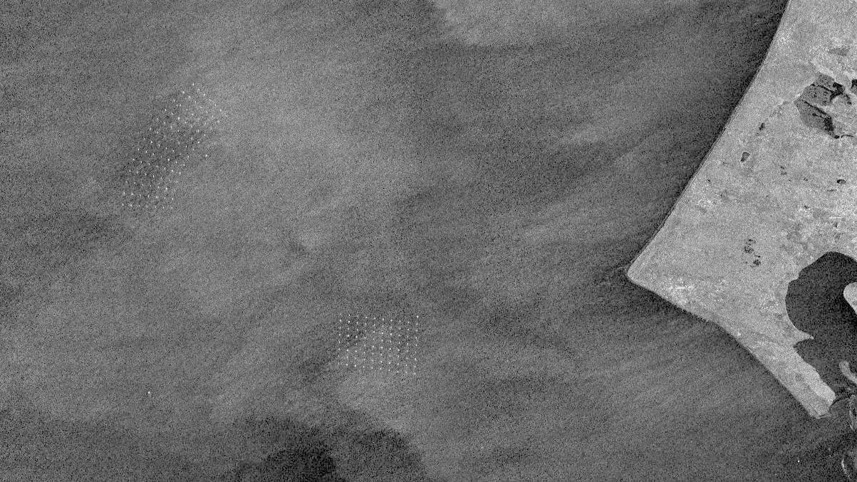 Wind farms are also detected by the radar satellite TerraSAR-X from space: The wind turbines show up as geometrically arranged bright spots on the black and white image. At the German Aerospace Center (DLR) it is possible to follow the development and construction of wind farms as well as information on wind levels or ocean swell are obtained from the recordings.