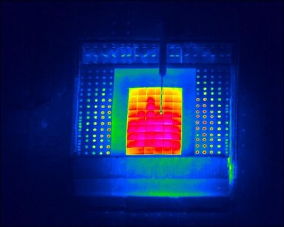 The infrared image shows the temperature distribution – between about 300 degrees Celsius (green) and 600 degrees Celsius (pink) – on the receiver’s surface. In the first test run in late September 2013, the researchers were able to produce hot air surpassing 600 degrees Celsius with the receiver.