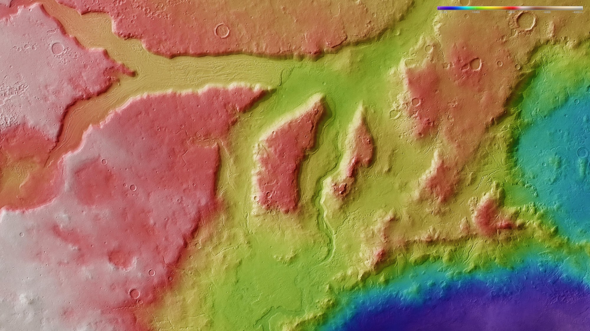 Topographic terrain models with an accuracy of 10 to 20 metres can be derived using stereo image data acquired by HRSC, from which the height above or below a reference surface can be determined. In the absence of 'sea level', the elevation data is referenced to an areoid – a modelled equipotential surface on which everything experiences the same gravitational attraction towards the centre of the planet. The slight differences in the plateau's height can be seen in the left half of this image of the Ismeniae Fossae region. The distinctive rectangular cross section of the approximately 2000-metre-deep valley is clearly visible.