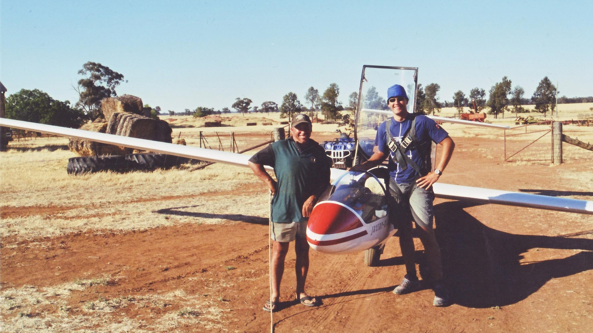 Kai Wicke together with an Australian farmer after an unplanned landing