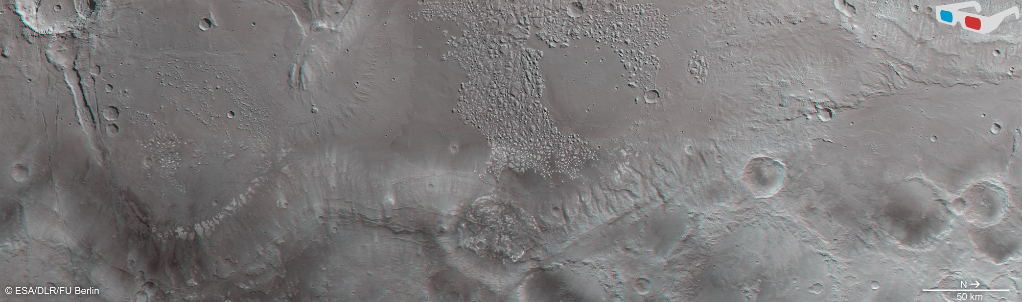 Anaglyph images are produced using the nadir channel of the DLR-operated HRSC camera system, which is directed vertically downwards on the surface of Mars, and one of the four stereo channels. Viewed through red-blue or red-green spectacles, they create a realistic, three-dimensional impression of the landscape. The depression in the Atlantic basin and the lower areas adjoining to the south are clearly visible in this image, as is the rugged landscape of Atlantis Chaos with its numerous peaks and mesas.