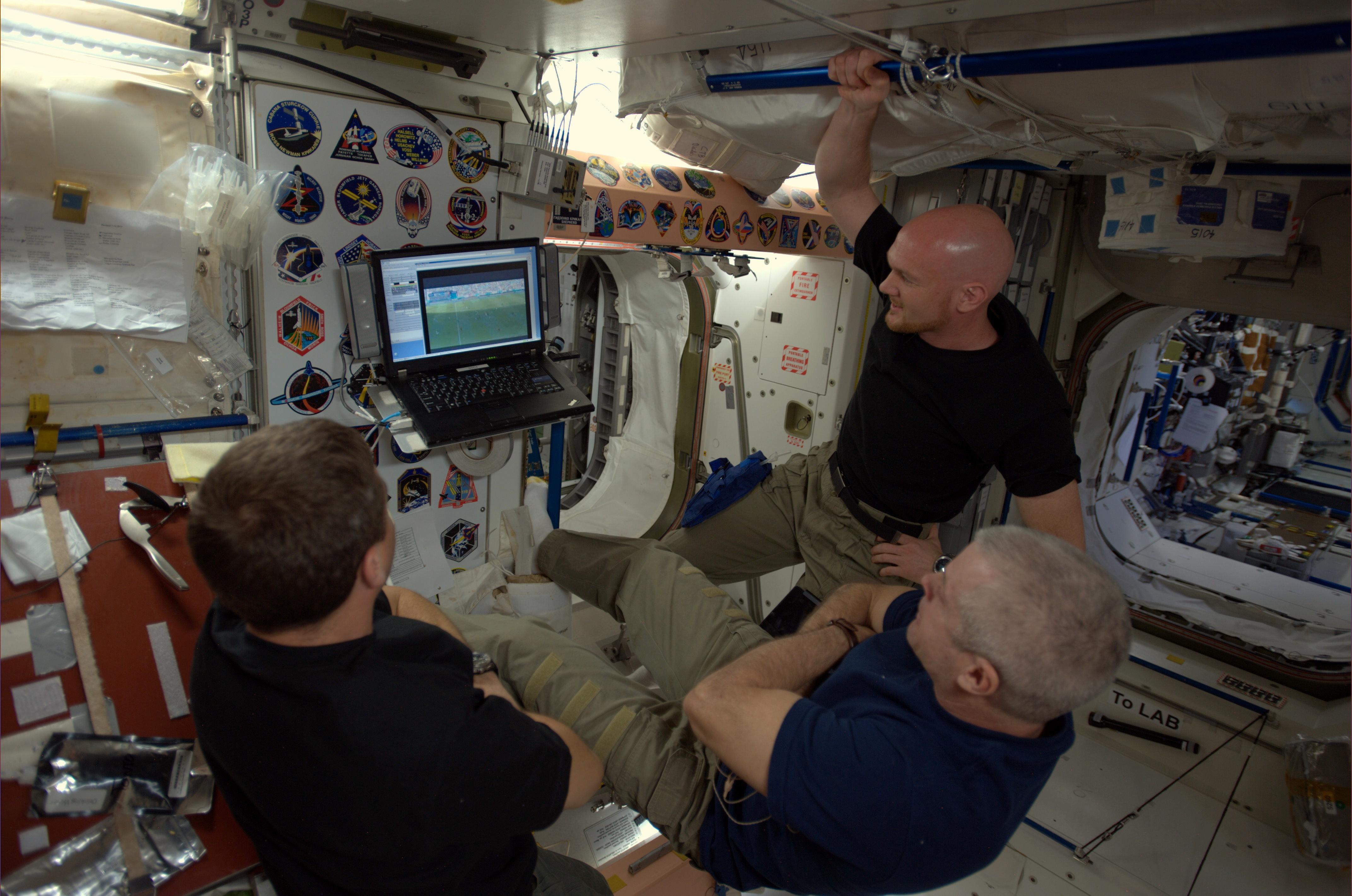 World Cup fever has also caught the International Space Station. On 16 June 2014, Alexander Gerst, Reid Wiseman (left) and Steven Swanson (front) took a break between science experiments to watch 20 minutes of the FIFA World Cup and sent congratulations to the German football team following its successful first World Cup match.