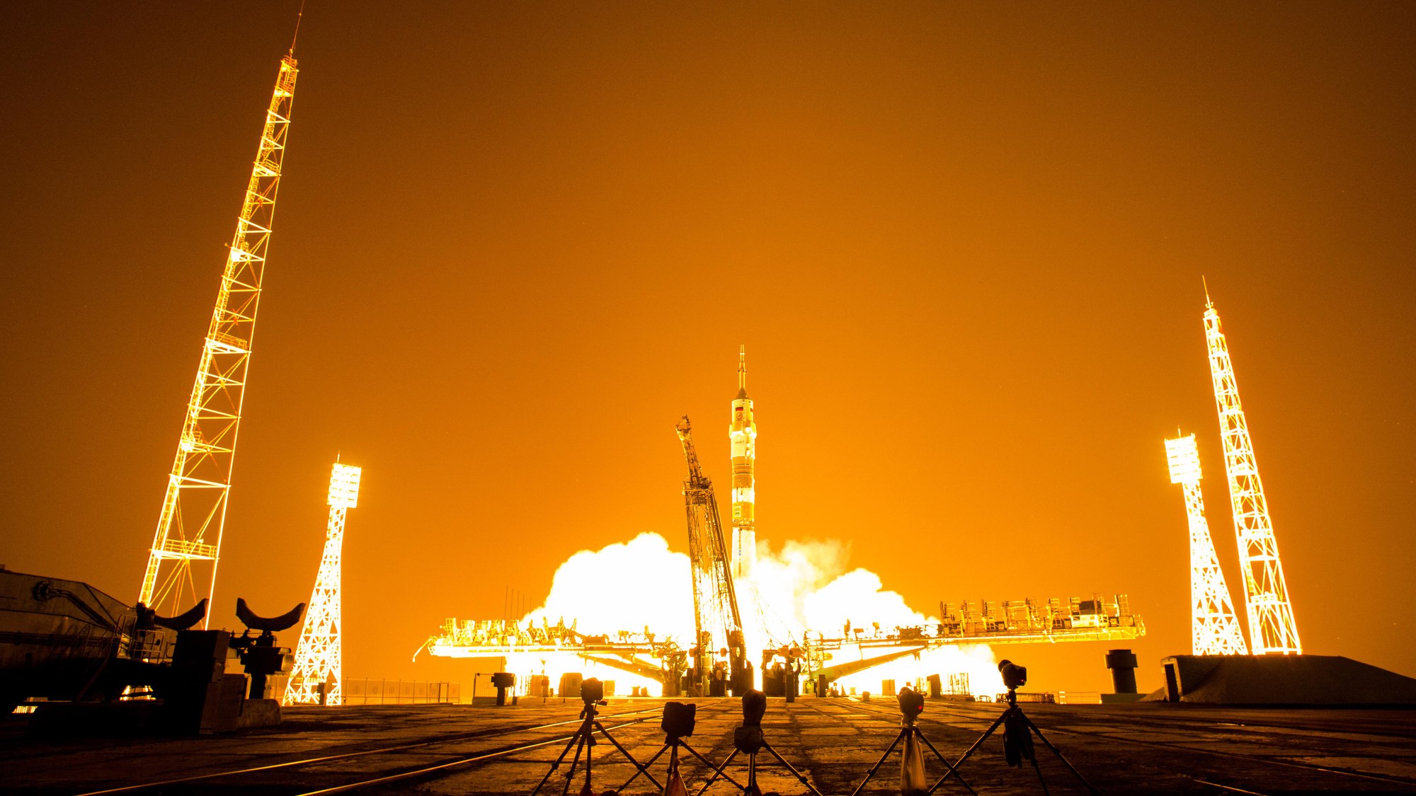 At 21:57 CEST on 28 May 2014 (02:57 local time, 29 May 2014), the Soyuz launch vehicle carrying the German ESA astronaut Alexander Gerst, Russian cosmonaut Maxim Suraev and the American astronaut Reid Wiseman to the International Space Station lifts off from Baikonur Cosmodrome in Kazakhstan.
