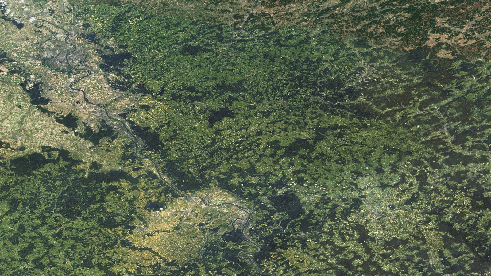 The optical satellite image of Cologne and Bonn shows the urban centres along the Rhine. But it is difficult to make out the smaller villages and houses in the rural areas.