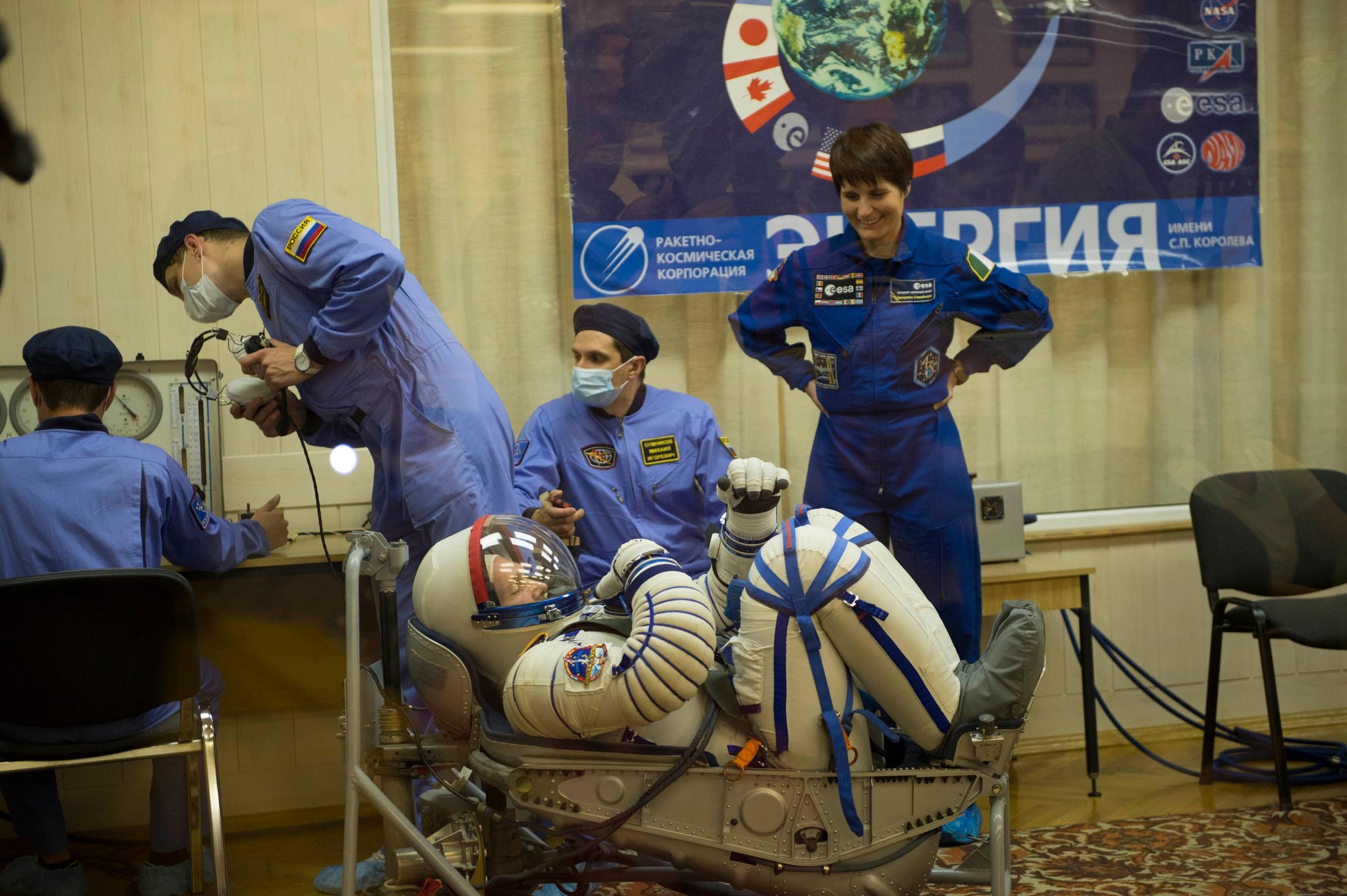Alexander Gerst, an ISS Expedition 40/41 Flight Engineer, during a pressure test of his Russian Sokol spacesuit in preparation building 254 at Baikonur Cosmodrome, Kazakhstan, about four hours before his launch to the International Space Station on 28 May 2014.