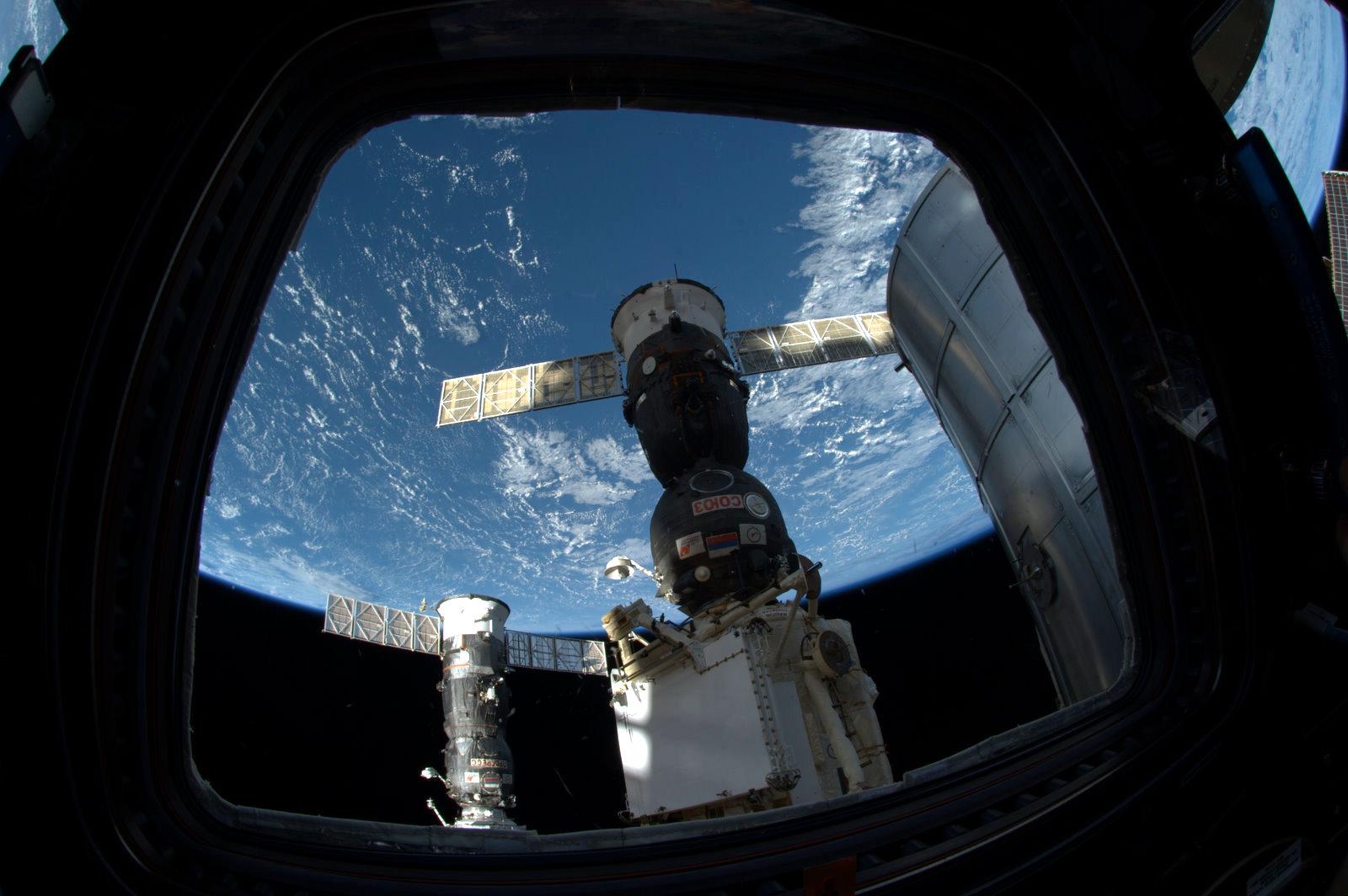 On 1 June 2014, the German ESA astronaut Alexander Gerst took this picture from the International Space Station. In the foreground, you can see the docked Soyuz spacecraft.