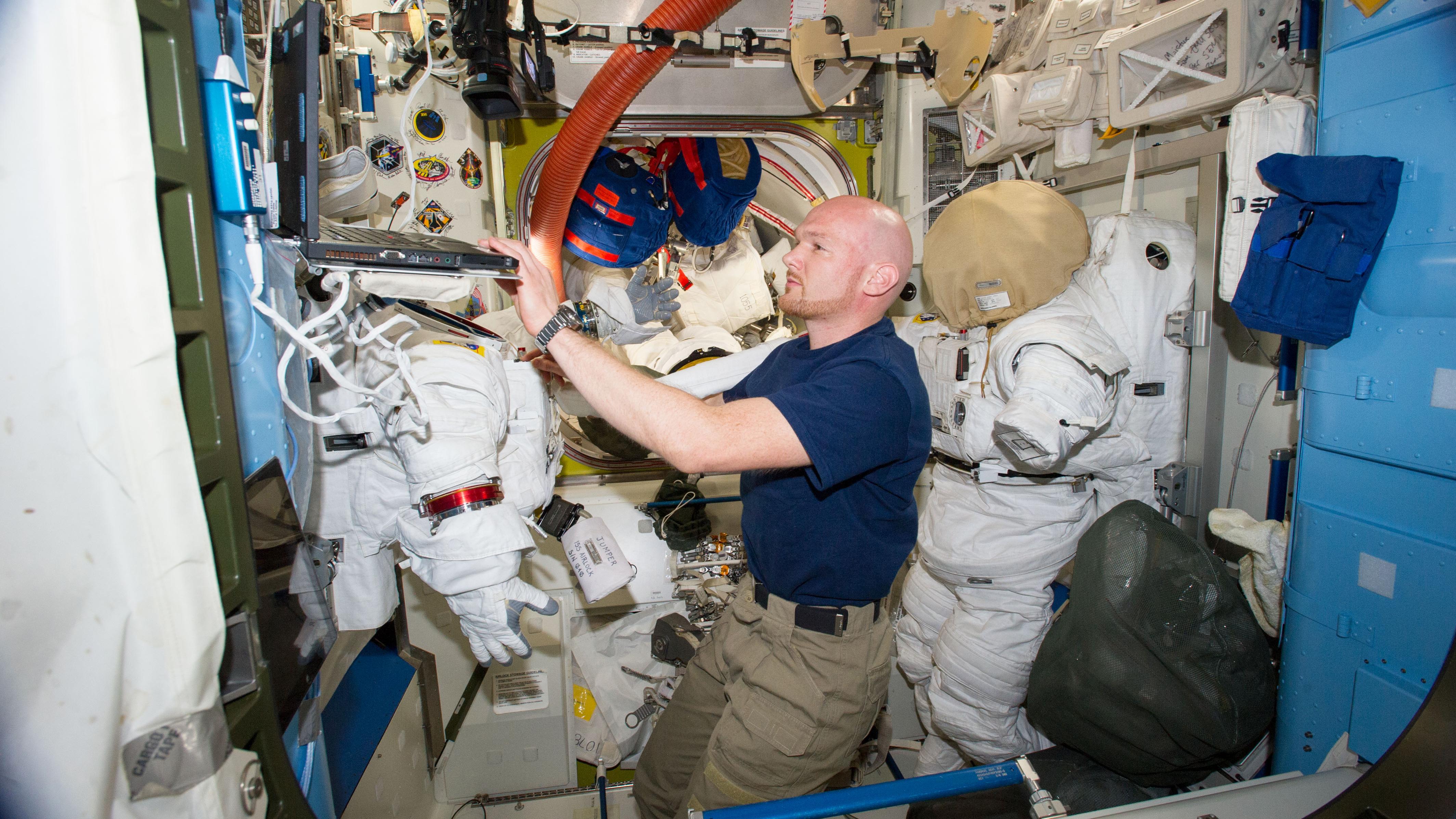German ESA astronaut Alexander Gerst uses a computer while working on an Extravehicular Mobility Unit (EMU) spacesuit in the Quest airlock of the International Space Station.