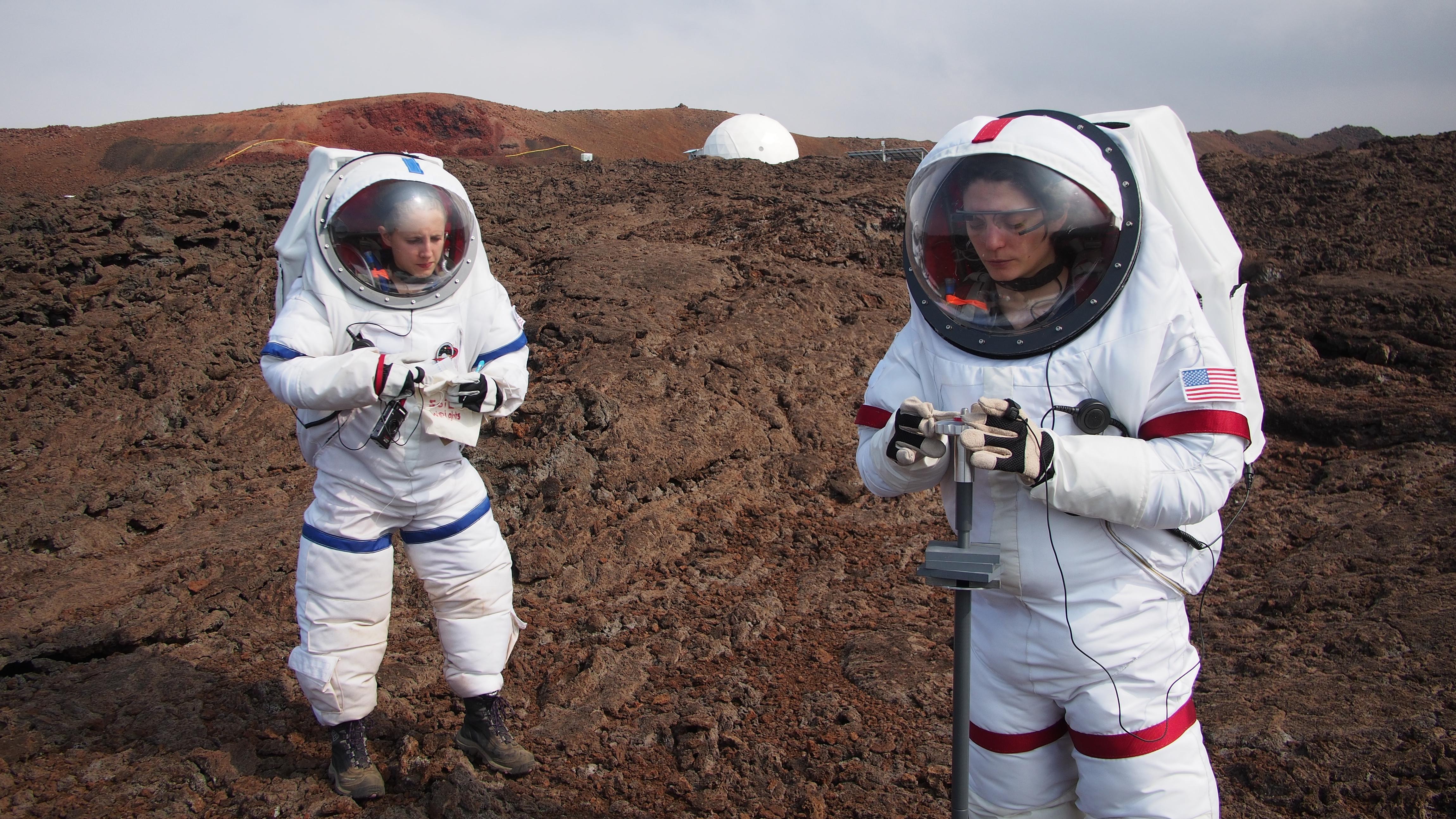 DLR scientist Lucie Poulet (right) conducted geological experiments during the simulated Mars mission on Hawaii. The scientist donned a spacesuit to keep the simulation as realistic as possible.