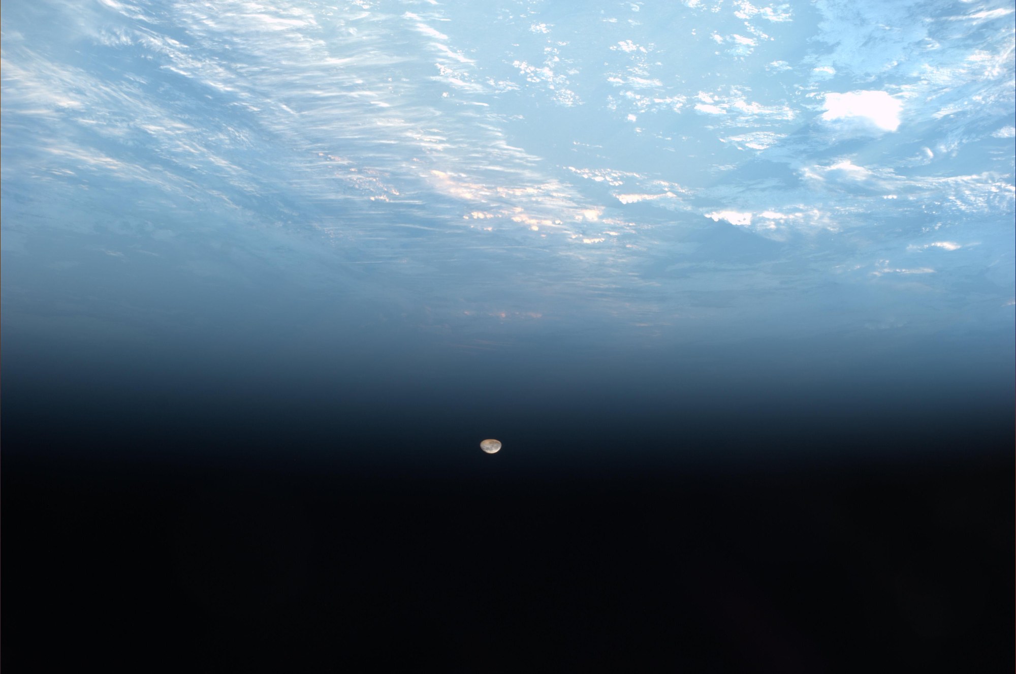 This picture was taken from the International Space Station by Alexander Gerst during the "Blue Dot" mission. It shows the moon rising behind Earth.