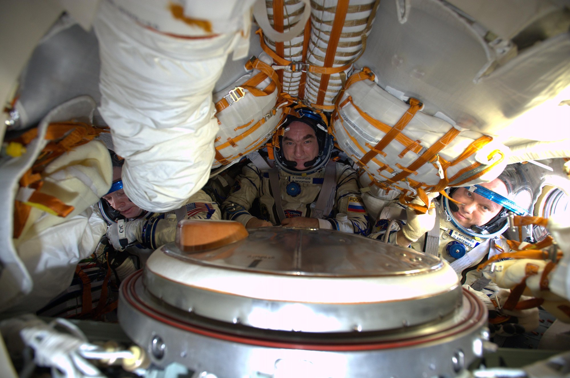 Before their return to Earth on 10 September 2014, the Soyuz 38S crew checked their spacesuits. This photograph was taken by German ESA astronaut Alexander Gerst on 2 September 2014.