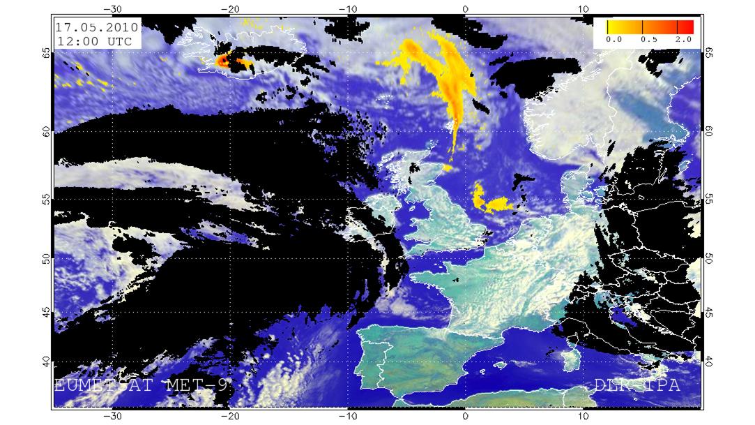 VADUGS-derived column concentration of volcanic ash in grams per square metre for a situation during the eruption of the Icelandic volcano Eyjafjallajökull on 17 May 2010 at 12:00 UTC. The processing is based on MSG-SEVIRI data.