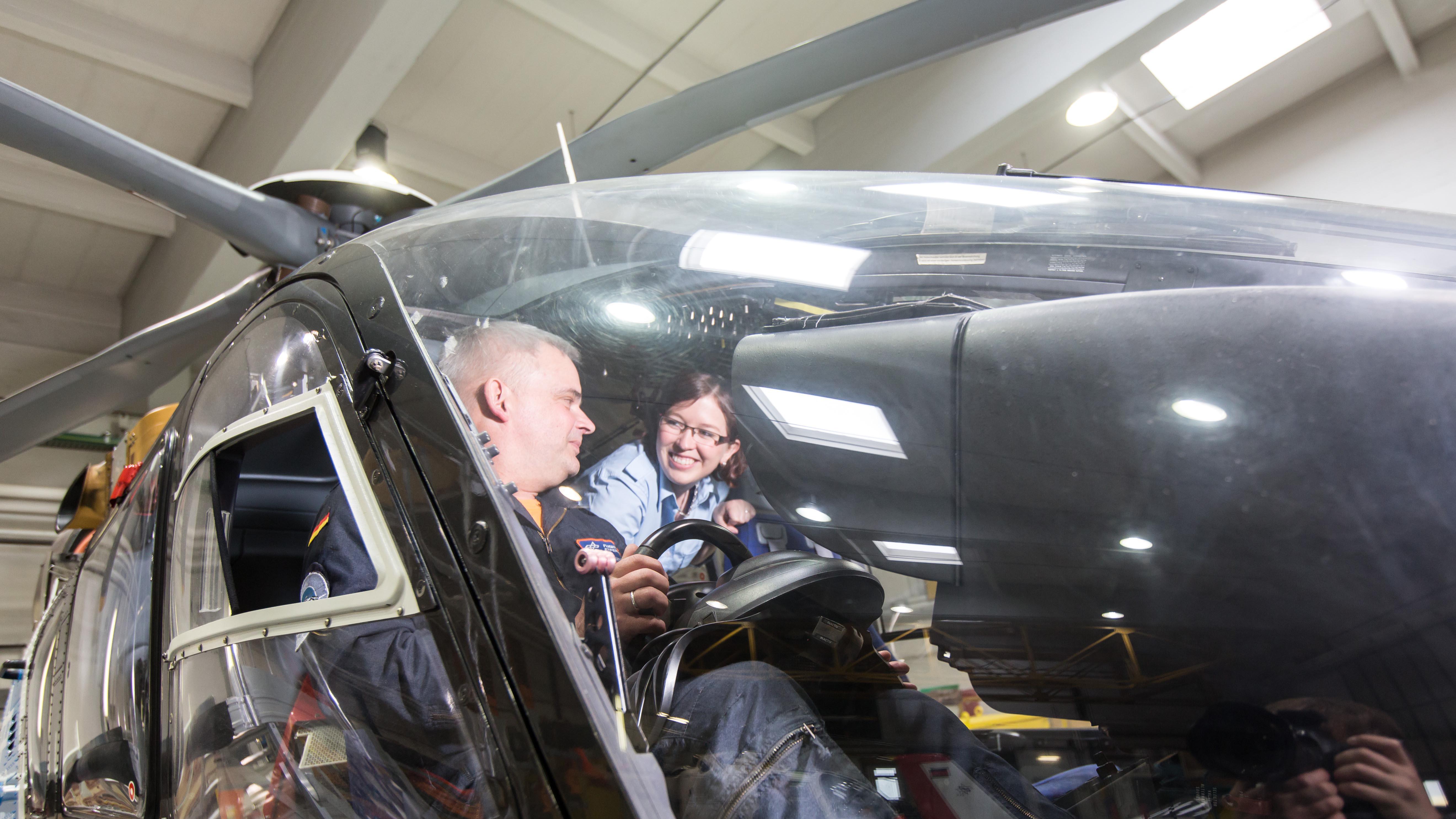 Bianca Gursky and test pilot Uwe Göhmann discuss the cockpit of the helicopter research ACT / FHS the first flight test with the myCopter- steering wheel. His baptism of fire in the simulator has already passed it. Now Uwe Göhmann want to use the helicopter to fly with the steering wheel through the air.
