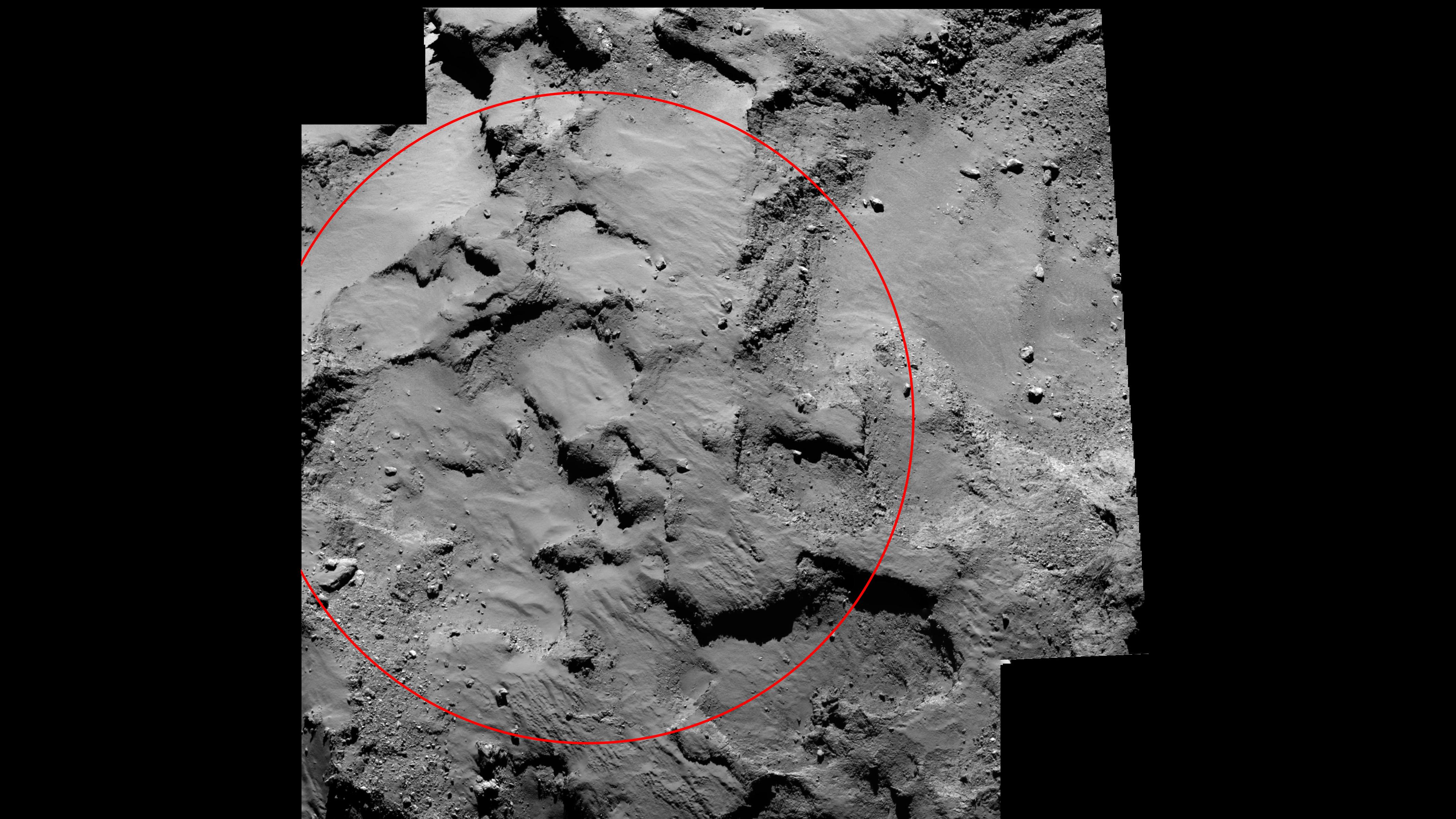 Landing site Agilkia is located on the 'head' of Comet 67P/Churyumov-Gerasimenko. The mosaic comprises two images taken by Rosetta's OSIRIS narrow-angle camera on 14 September 2014 from a distance of about 30 km. The image scale is 0.5 metres per pixel. The circle is centred on the landing site and is approximately 500 metres in diameter.