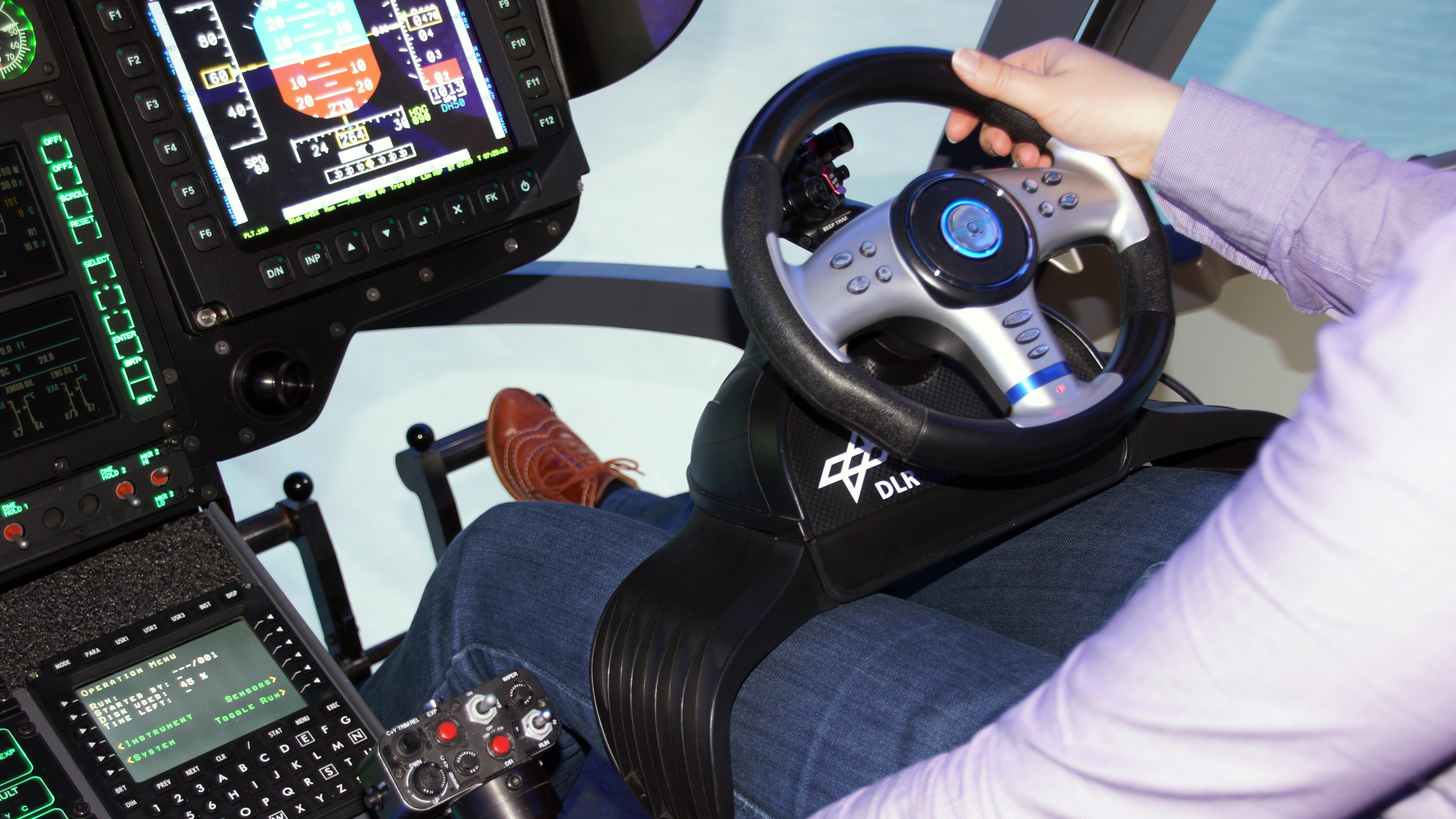 The cyclic stick – responsible for movements about the longitudinal axis (roll) and the transverse axis (pitch) – is missing from the myCopter steering wheel system. One stick remains, exclusively responsible for altitude. Alternatively, this aspect could be controlled using a paddle fitted to the steering wheel. Just as with the accelerator and brake in a car, the pedals control speed and can even cause the vehicle to hover. An eight-way switch on the myCopter steering wheel controls reverse and lateral flight. The steering wheel has already completed its maiden flight in the virtual environment of the Air Vehicle Simulator (AVES) operated by DLR in Braunschweig.
