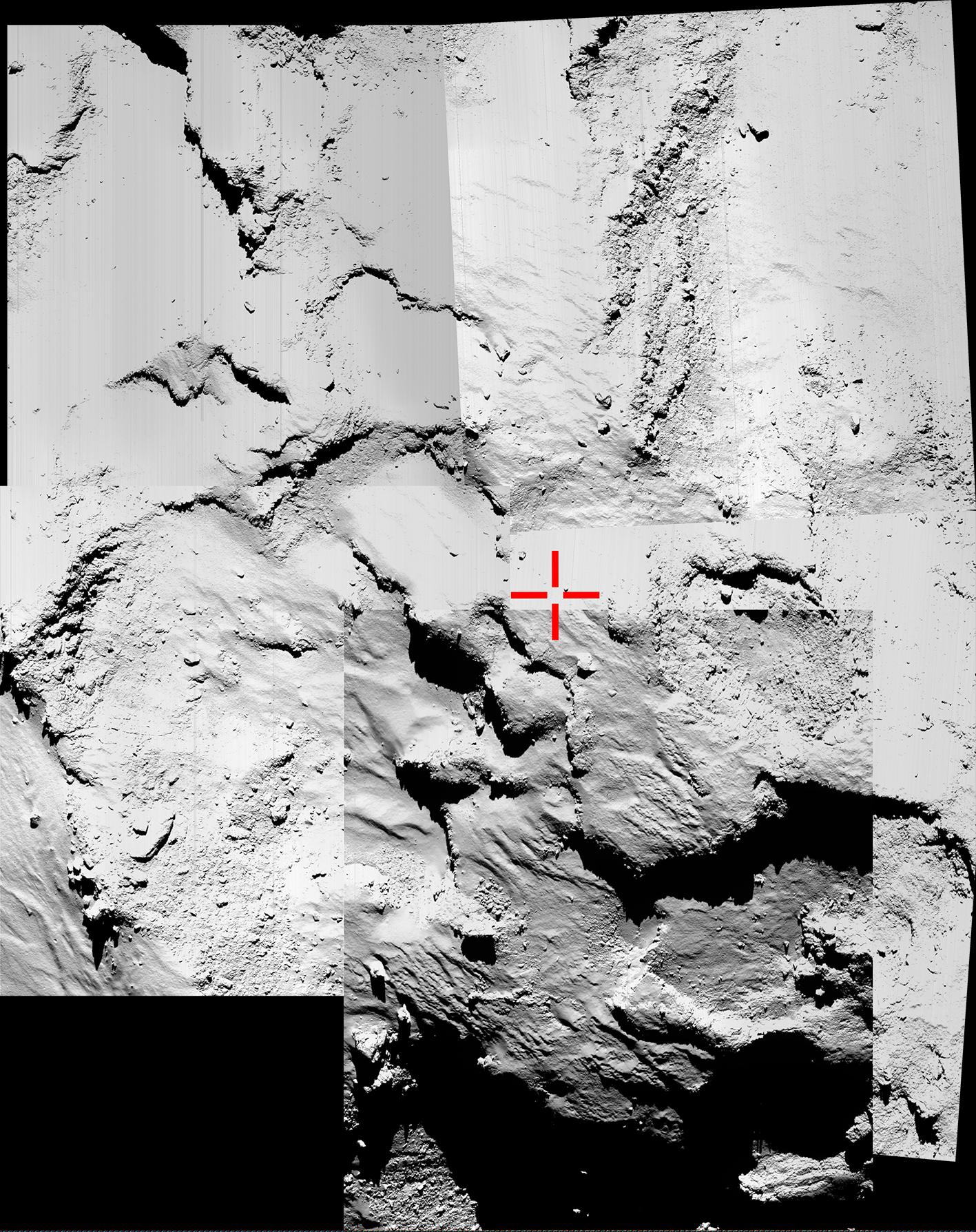 This five-image montage of OSIRIS narrow-angle images is being used to try to identify the final touchdown point of Rosetta’s lander Philae. The images were taken around the time of landing on 12 November when Rosetta was about 18 km from the centre of Comet 67P/Churyumov-Gerasimenko (about 16 km from the surface). The signal confirming the first touchdown arrived on Earth at 17:03 CET. It is thought that Philae bounced twice before settling on the surface of the comet. The red cross marks the first touchdown point.