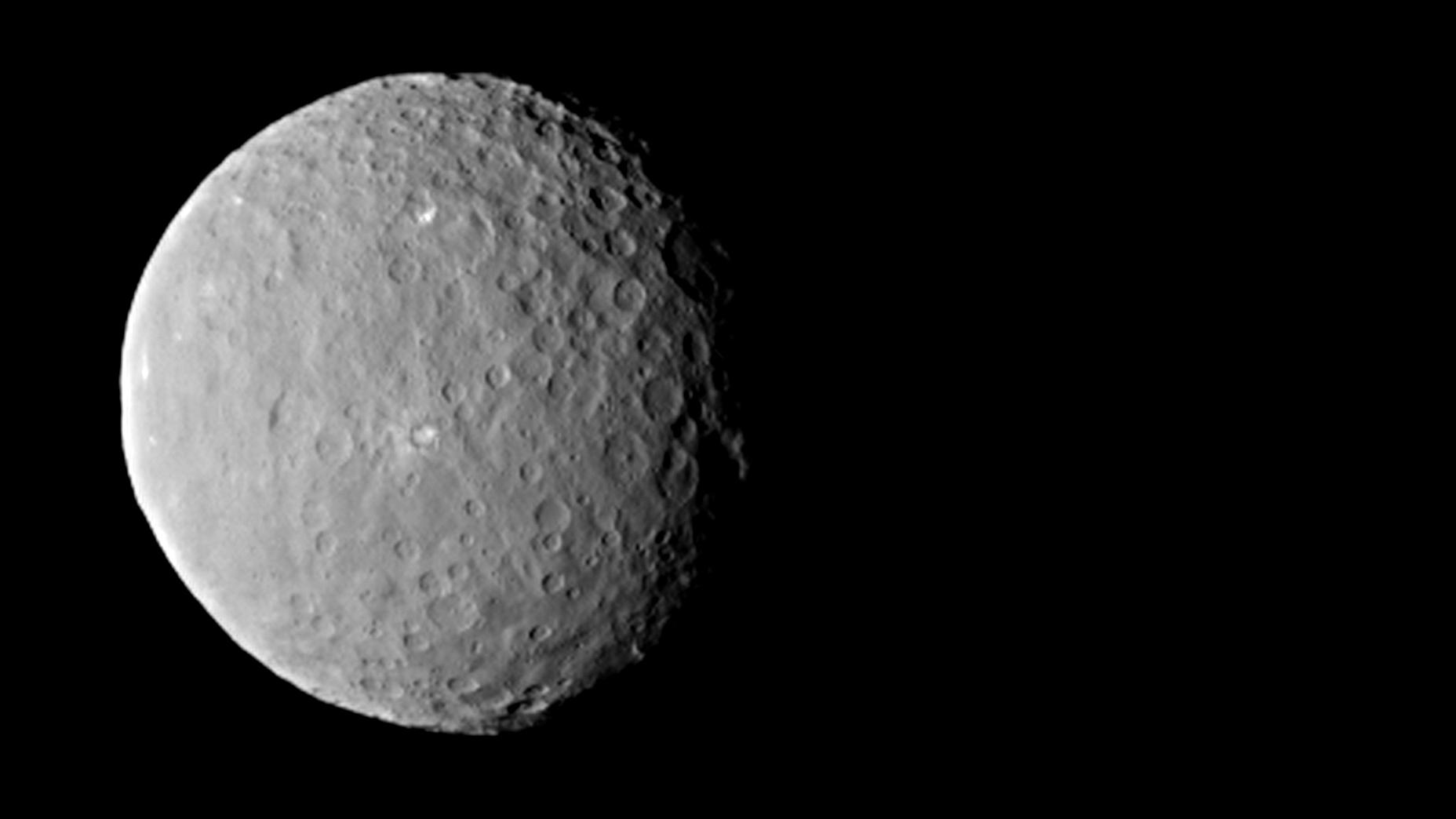 The image of the dwarf planet Ceres shows numerous craters strewn across its surface. It was taken from a distance of 46,000 kilometres using the Framing Camera on board NASA’s Dawn spacecraft. Brighter regions are clearly visible. An interpretation of their significance was not yet possible when the image was acquired on 19 February 2015.