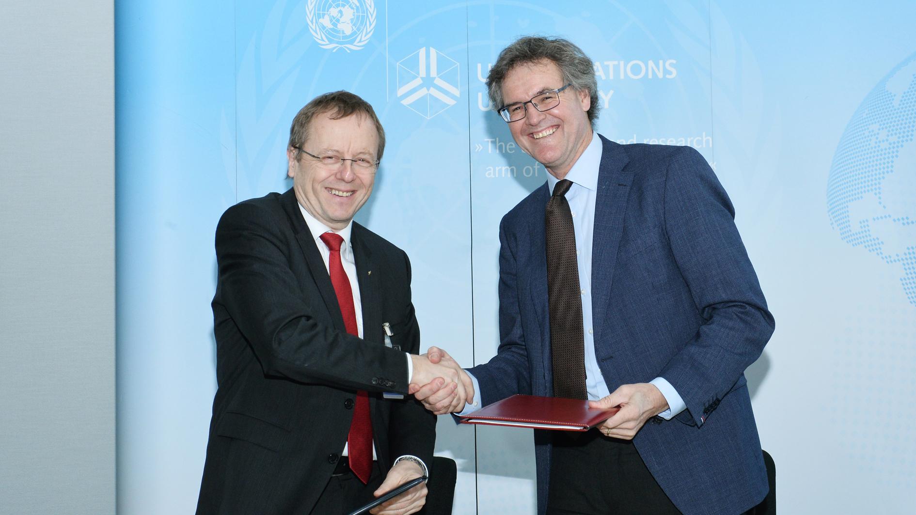 Johann-Dietrich Wörner, Chairman of the DLR Executive Board (left), and Jakob Rhyner, Vice Rector in Europe of the UNU and Director of its Institute for Environment and Human Security (EHS) in Bonn, are pleased with the continued cooperation of their organisations. The MoU signing was held in Bonn on 23 February 2015.