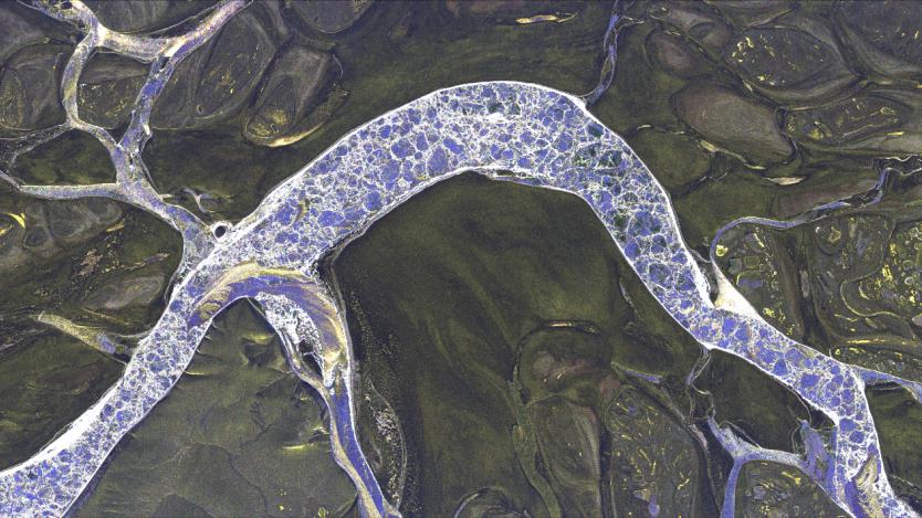 This TerraSAR-X image shows ‘pancake ice’ on the Siberian Lena River and ice sheets on the water in a large part of the arctic river delta. When soil and water begin to freeze, the exchange of carbon is reduced in permafrost landscapes.