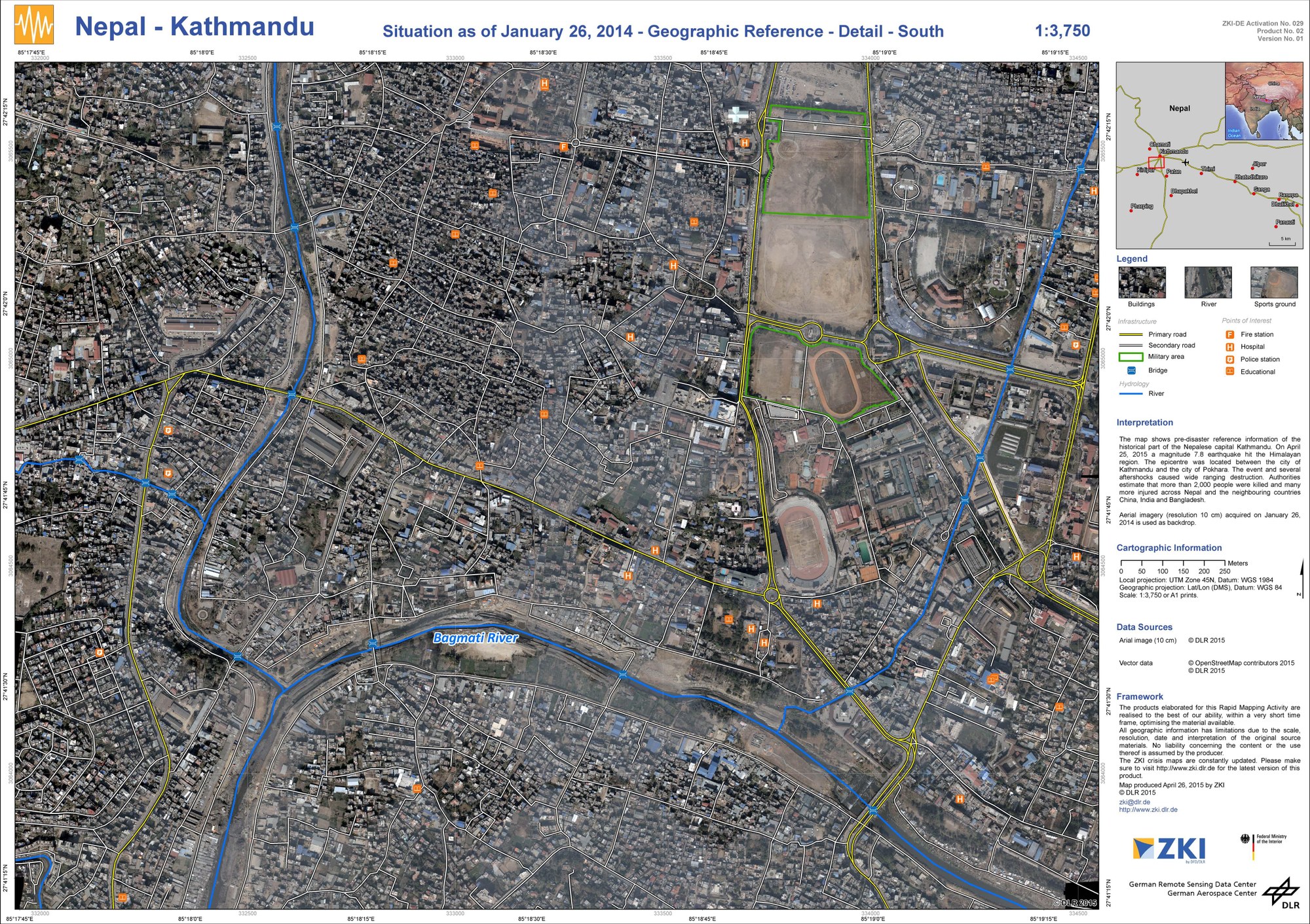 The image shows the southern part of historic Kathmandu. This image was also taken on 26 January 2014 as part of the Mountain Wave project and is now being used as a reference map for relief workers. The entire file and legend is available for ‘Download’.