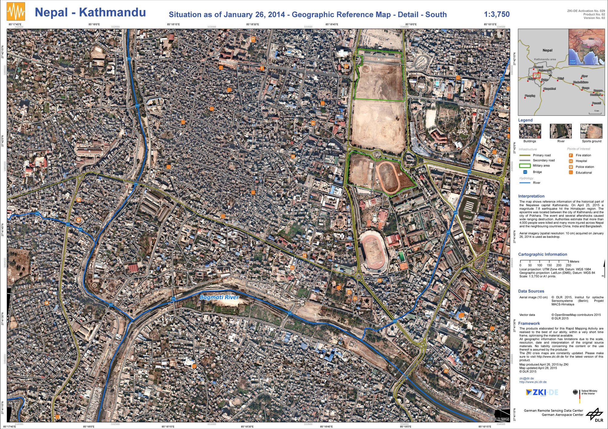 The image shows the southern part of historic Kathmandu. This image was also taken on 26 January 2014 as part of the Mountain Wave project and is now being used as a reference map for relief workers. The entire file and legend is available for ‘Download’.