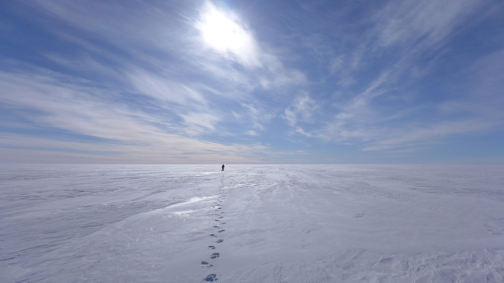 DLR researcher Georg Fischer makes his way to the next radar reflector. At the South Dome, the highest test area, the favourable weather conditions made it possible to anchor the radar reflectors at just one kilometre from the aircraft.