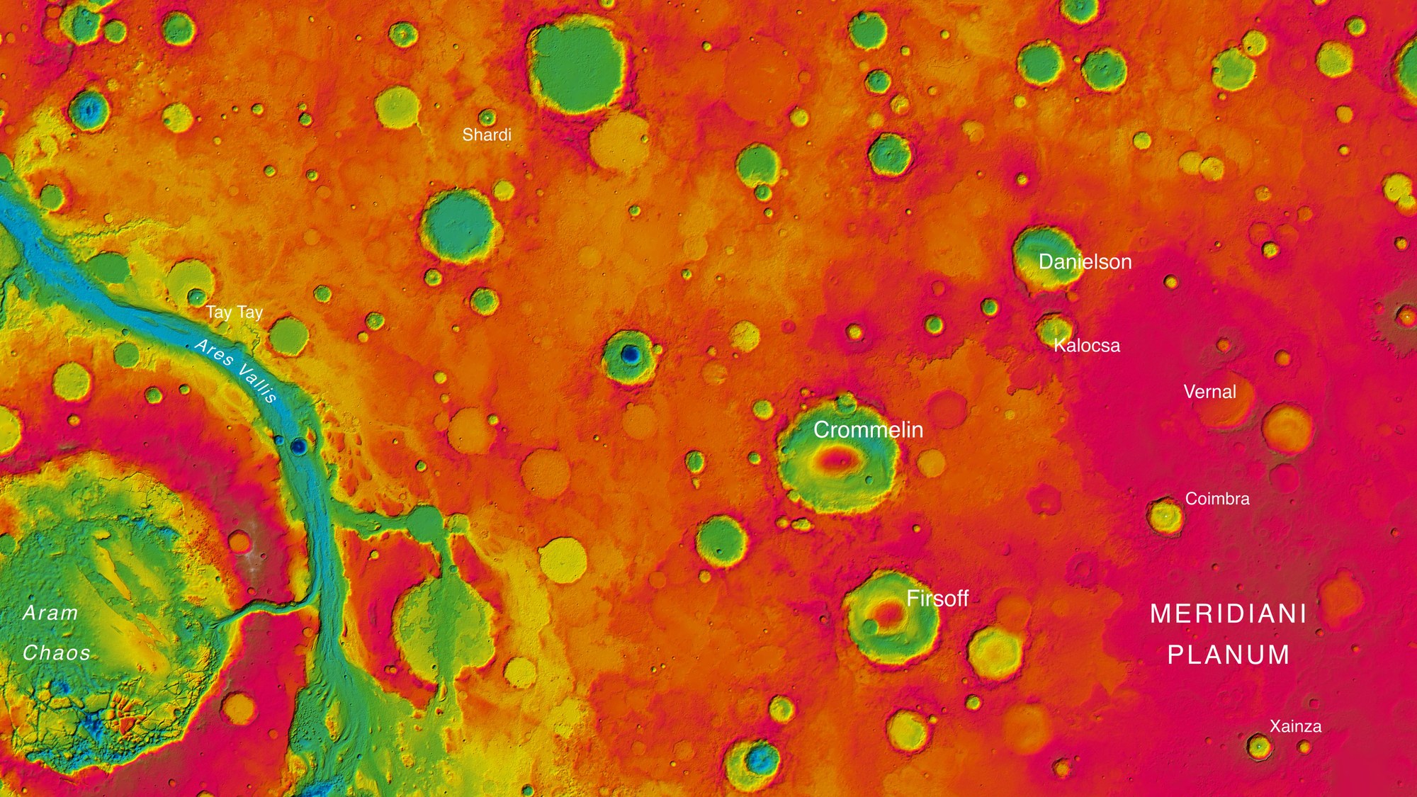 The High Resolution Stereo Camera (HRSC) operated by DLR on board ESA’s Mars Express spacecraft has been imaging parts of the planet’s surface every third of fourth orbit since January 2004. In the course of 11 years, it has created over 4000 image strips, each between 50 and 100 kilometres wide and several hundred kilometres long from north to south. The stereo images, acquired with nine sensors, show not just the Martian surface in colour, but also allow the elevation to be computed for each pixel. The Working Group for 3D Mapping in the HRSC team has now performed these calculations for the eastern half of the map sheet ‘MC-11’ near the Martian equator. This image mosaic covers 2.3 million square kilometres, an area about six times the size of Germany. The figure shows a detail of the colour-coded relief map with high altitude areas in red and orange and low-lying areas in yellows, greens and blues. The range of differences in height is about 5000 metres.